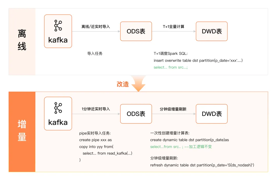 从离线到增量化改造往往涉及大量SQL的迁移,如果没有简单的方法,该过程会涉及大量的工作。通用增量计算的SQL语法、加工逻辑与离线保持一致,绝大部分内容可以用“copy - paste” 的方式做改造,其中少数调度配置做修改即可。下面是本次测试中简单场景的改造示意图(绿色字体是加工逻辑保持不变):