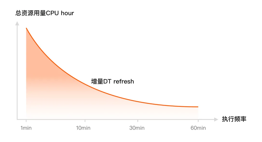 能灵活平衡时效性和资源开销对业务来说非常关键,有了这个能力,关键业务或者关键时间点(如大促时期)可以增加资源获得更高的时效性,非关键业务/平常时段可以降低一定时效性减少资源开销。在本次实践中,增量计算测试了不同场景不同时效性下的资源开销,从结果来看具备调节能力。具体来说,资源开销和时效性之间关系是:介于固定常数关系到反比关系之间,当每次增量刷新涉及存量数据越多,越接近反比,反之越接近常数。