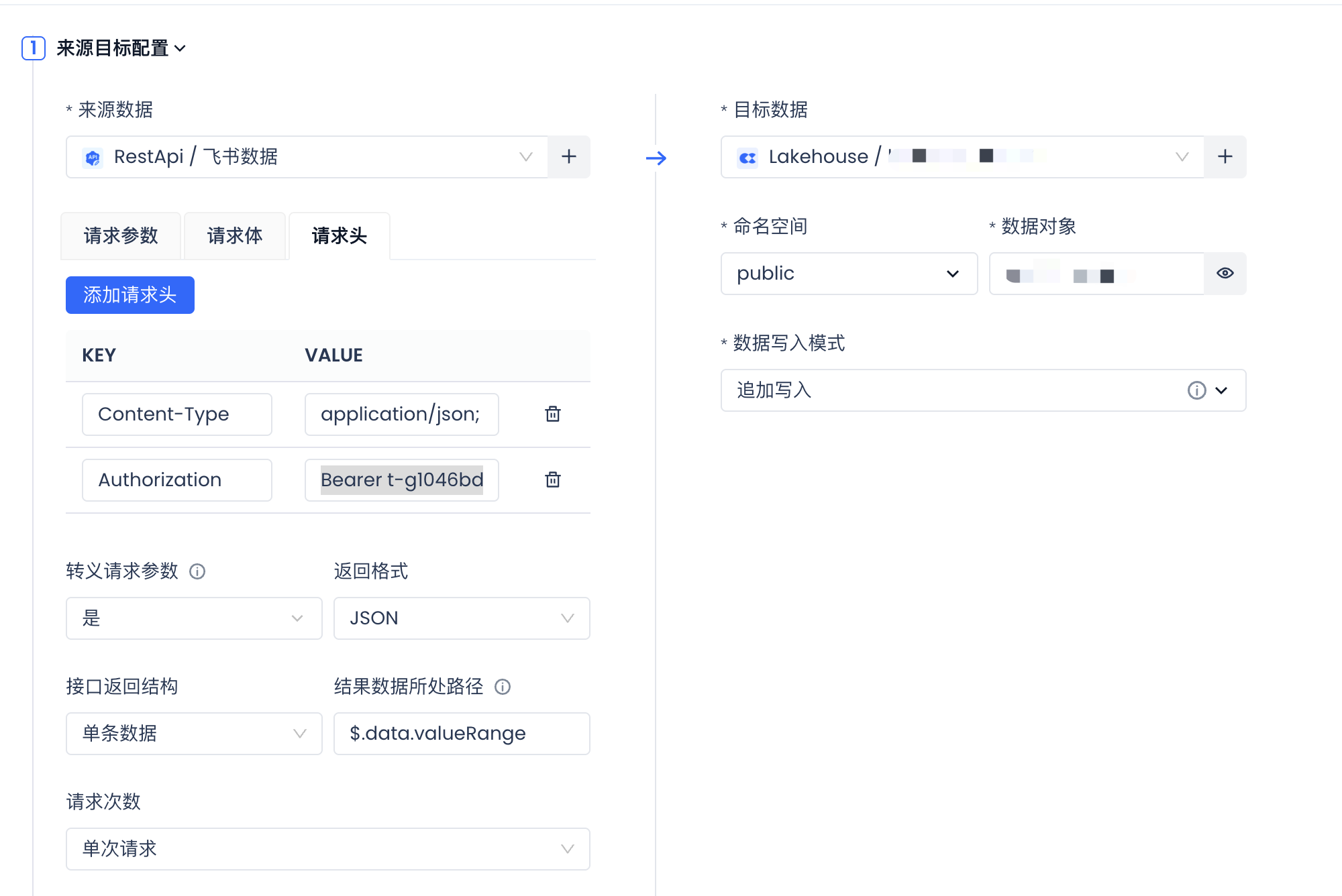 字段映射配置:暂不支持嵌套数组格式的json解析,因此针对飞书API的数据,仅支持将value值通过string的类型导入至目标表中。