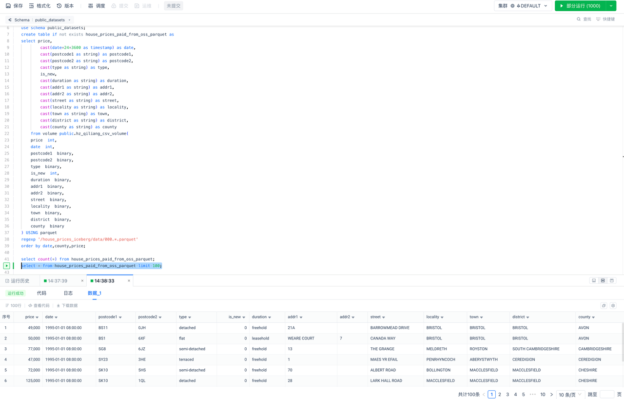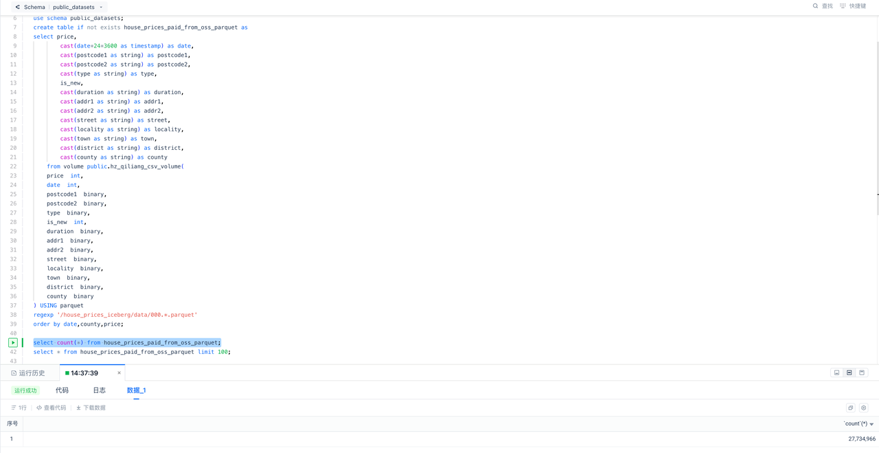 查看总共有多少行数据(需要提前创建好云器Lakehouse的STORAGE CONNEDCTION和EXTRENAL VOLUME):