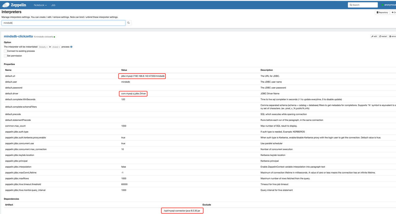 创建Zeppelin的Interpreter,通过MySQL JDBC连接MindsDB