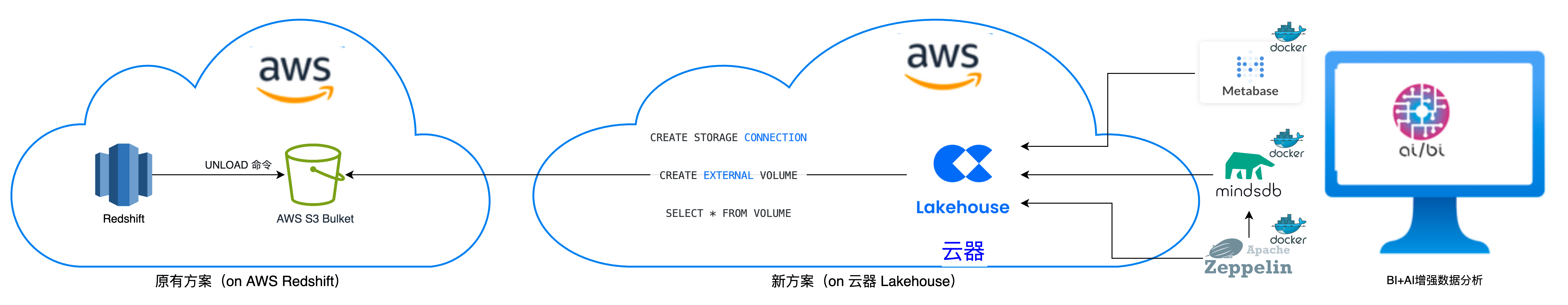 - 实现AWS数据仓库经过数据湖,用云器Lakehouse实现湖仓一体的优化提升,大幅降低数据存储成本、计算成本和运维成本。