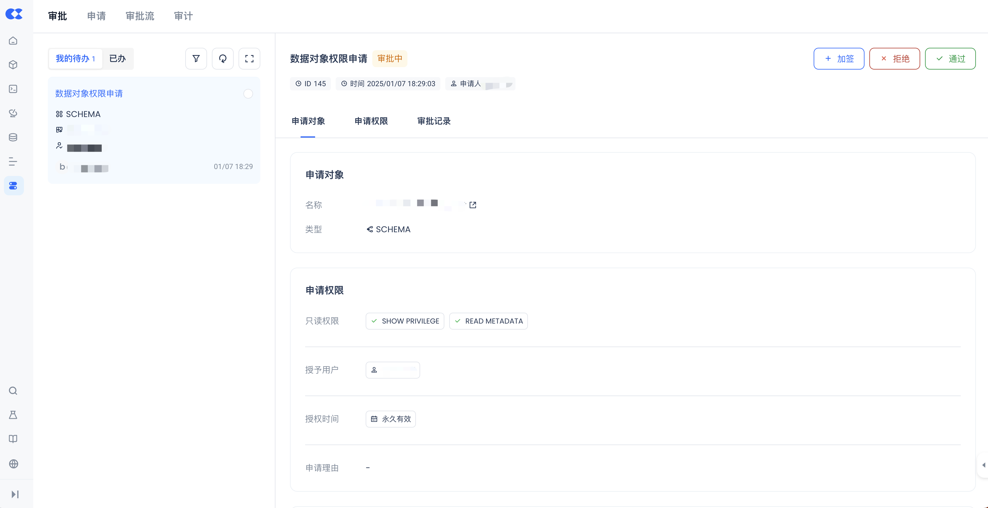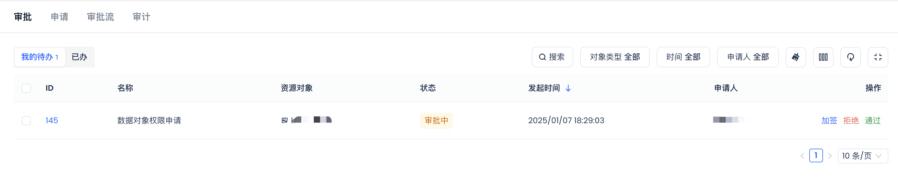 当用户点击了申请权限功能后,系统会基于申请对象所属的审批流自动创建一个审批工单进行流转审批。申请用户可在审批_申请中,查看自己申请的信息即审批状态