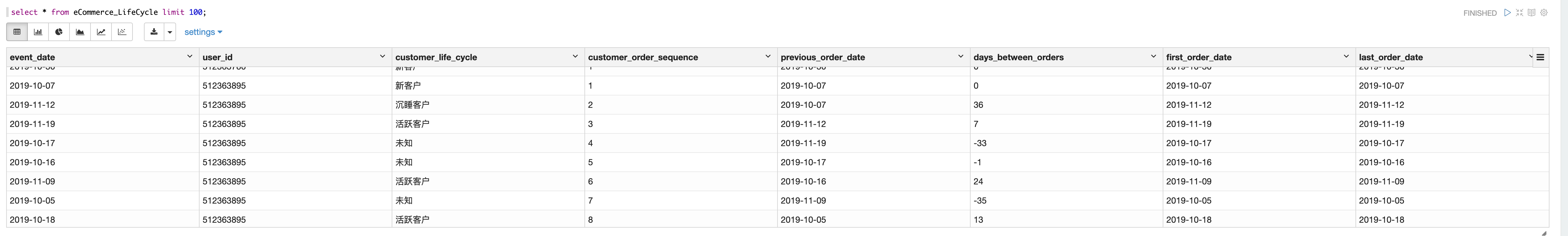 下一个查询使用CASE 语句创建一个附加的 customer_life_cycle 列,以根据 days_between_orders 列指示订单是来自新客户、活跃客户还是已失效客户。在此示例中,如果订单发生在距上一个订单 1 到 365 天之间的任何时间,则客户被视为活跃客户;如果先前订单超过 365 天,则客户被视为已失效。这具有高度的业务特定性,因此您的可能会有所不同。