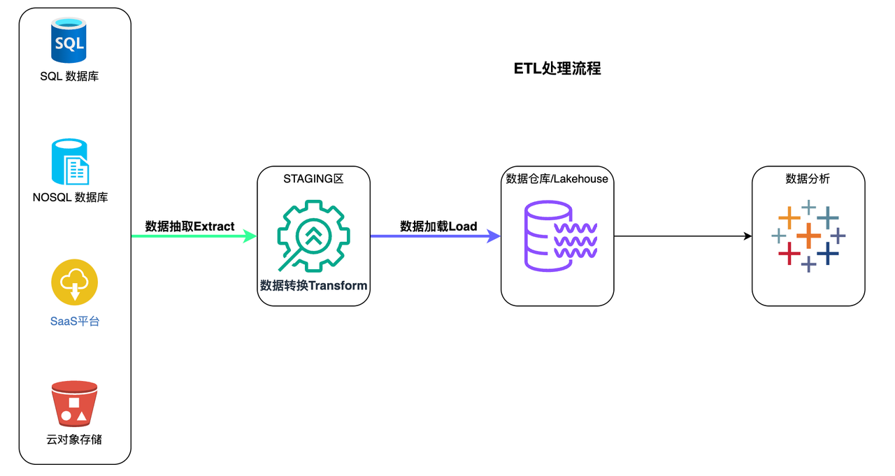 - 数据被加载到目标数据仓库系统中,并准备好由BI 工具或数据分析工具进行分析。