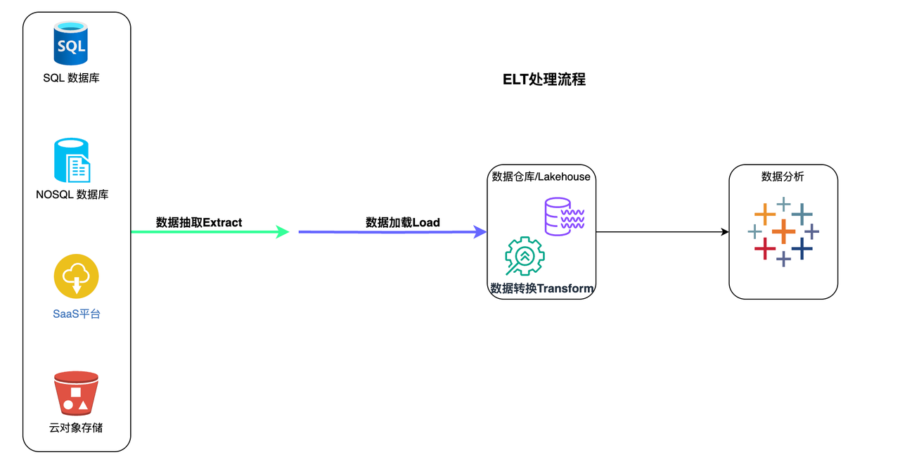 - 数据在目标系统中进行转换,并准备好由 BI 工具或数据分析工具进行分析