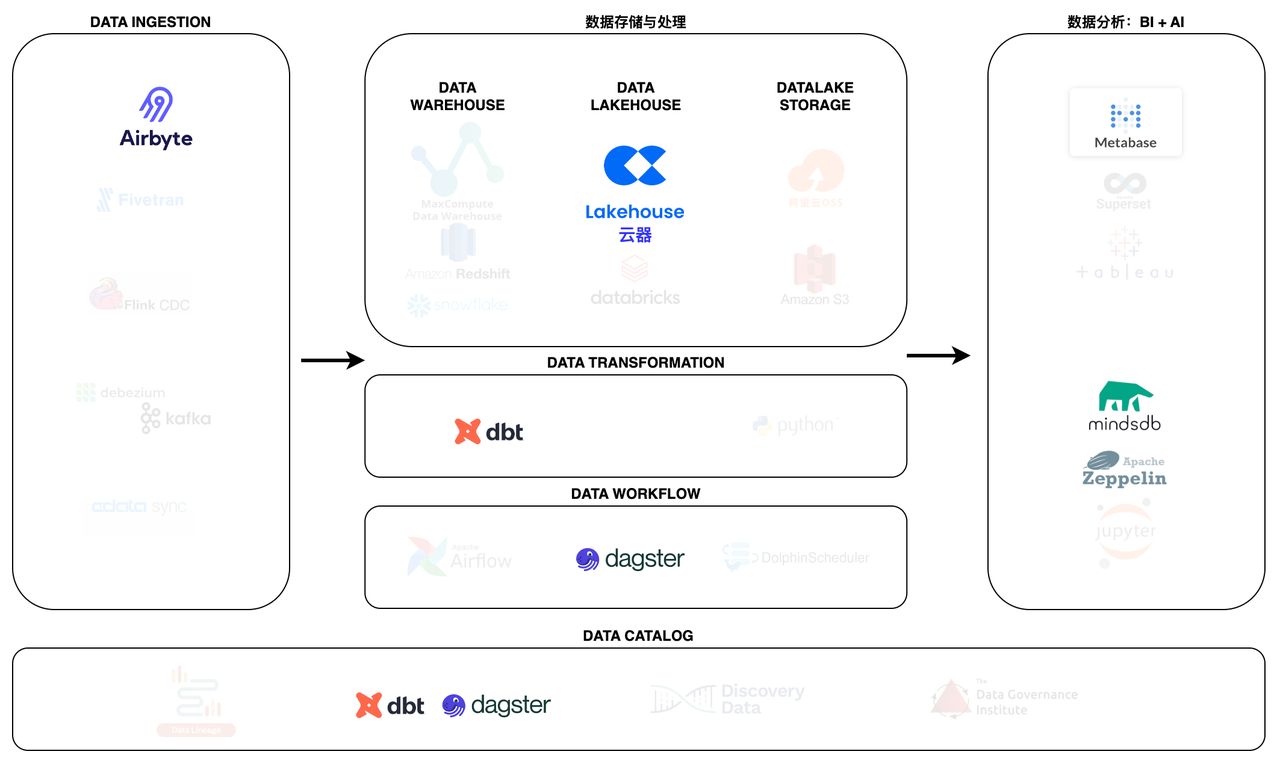 - 以云数据仓库/数据湖/Lakehouse为中心。MDS旨在与Redshift、BigQuery、Snowflake、Databricks、MaxCompute、云器Lakehouse等云数据仓库,以及数据湖和Lakehouse无缝集成。