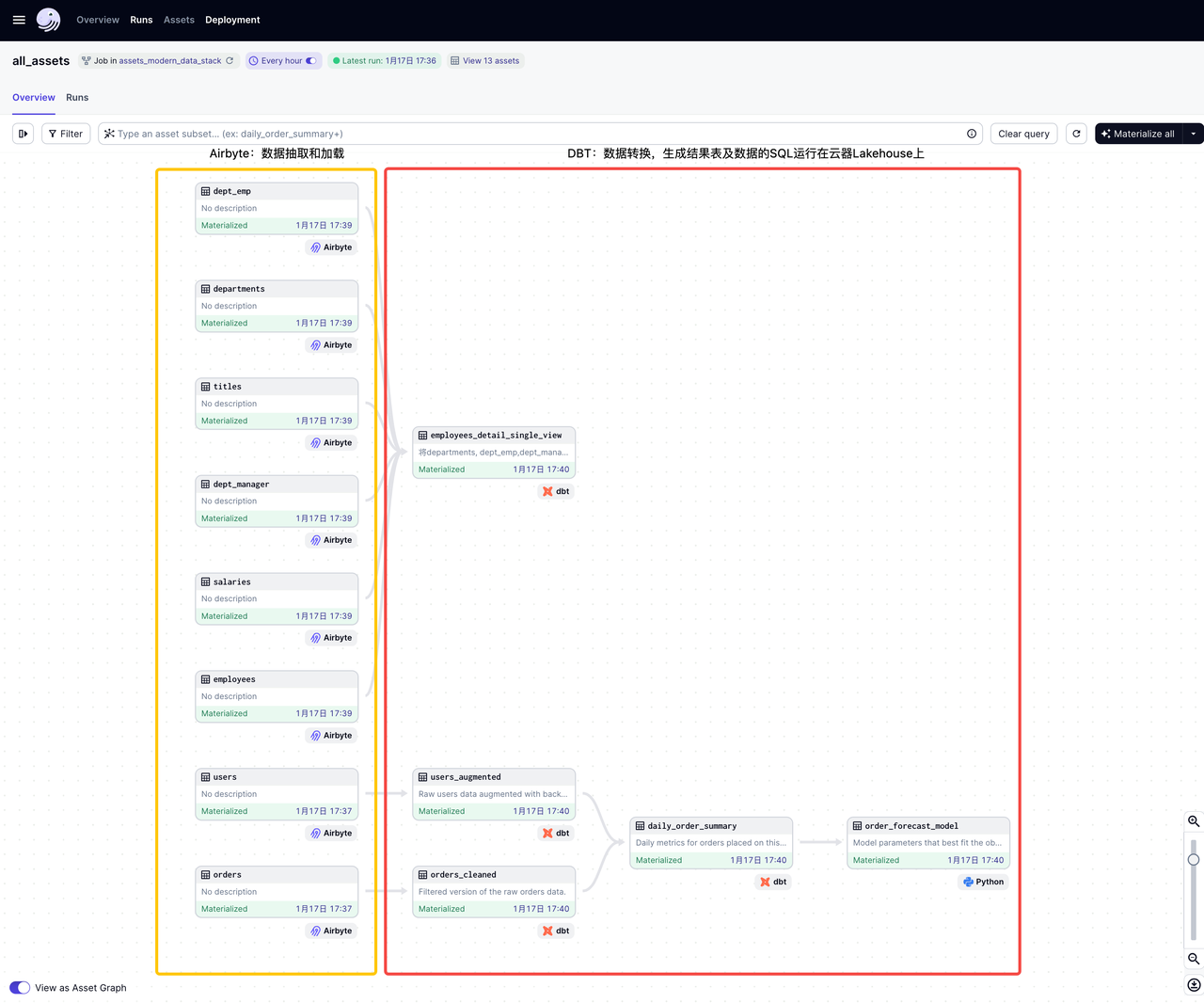 dagster实现了软件定义的、ETL pipeline完整的数据工作流dag图,非常清晰易读: