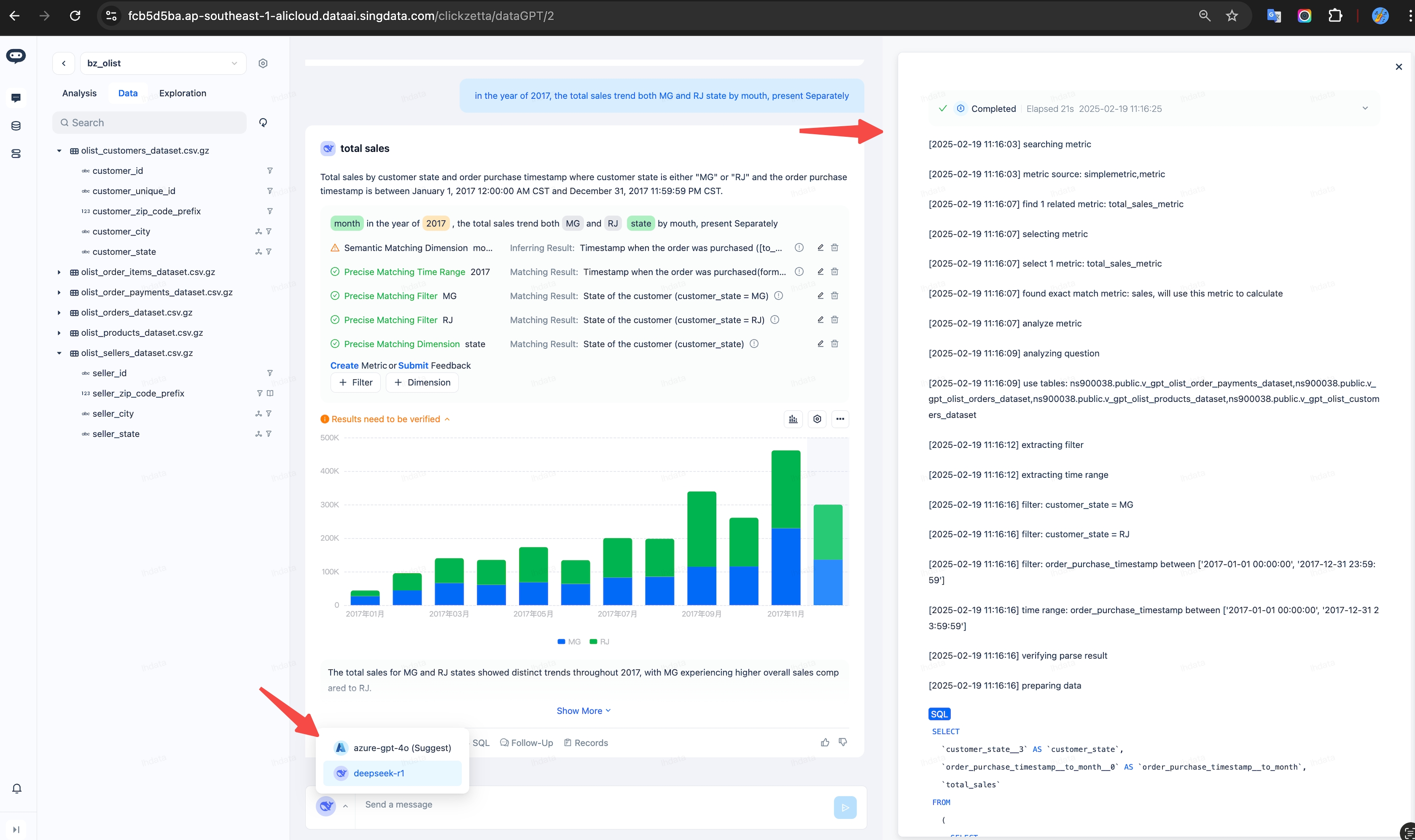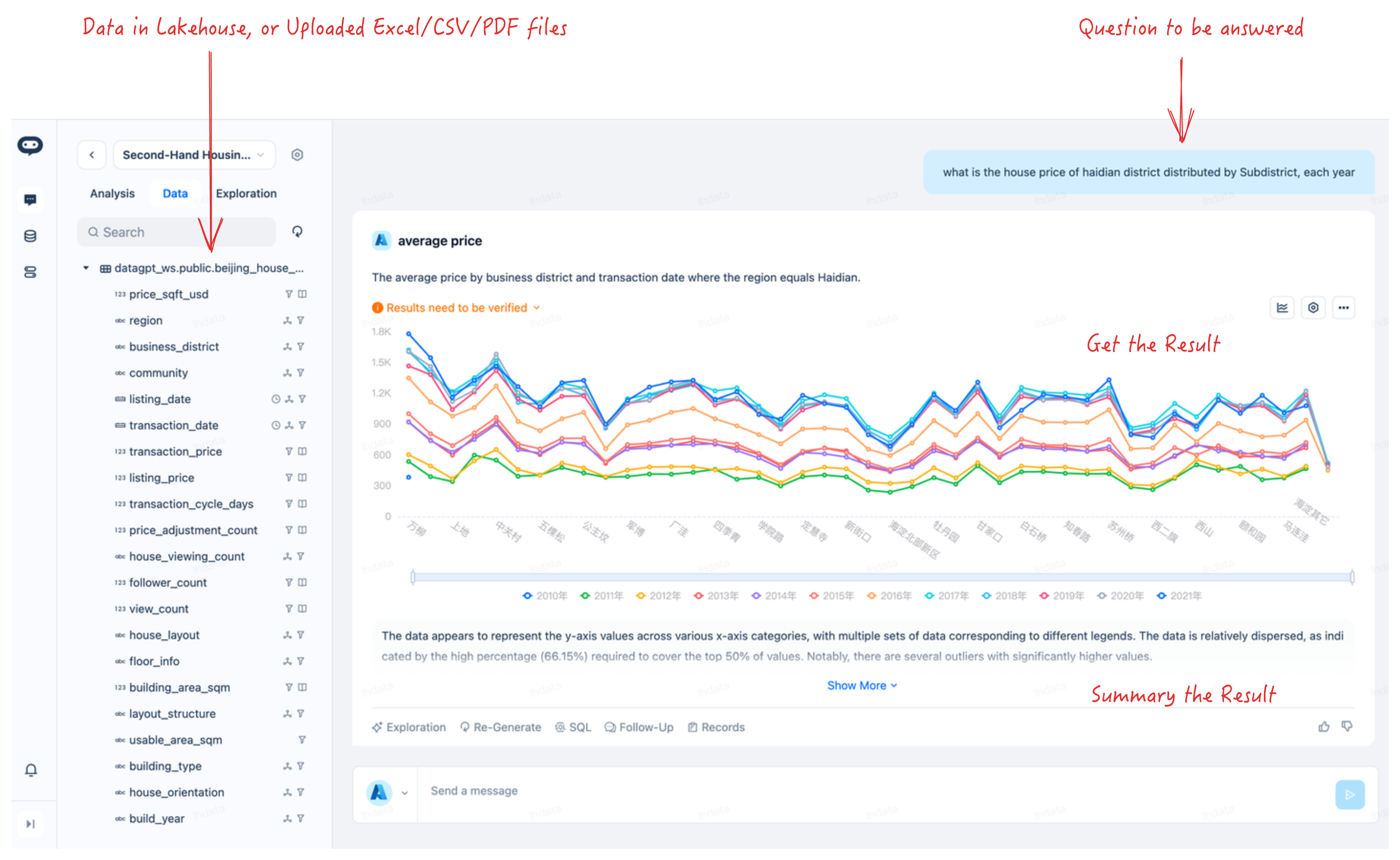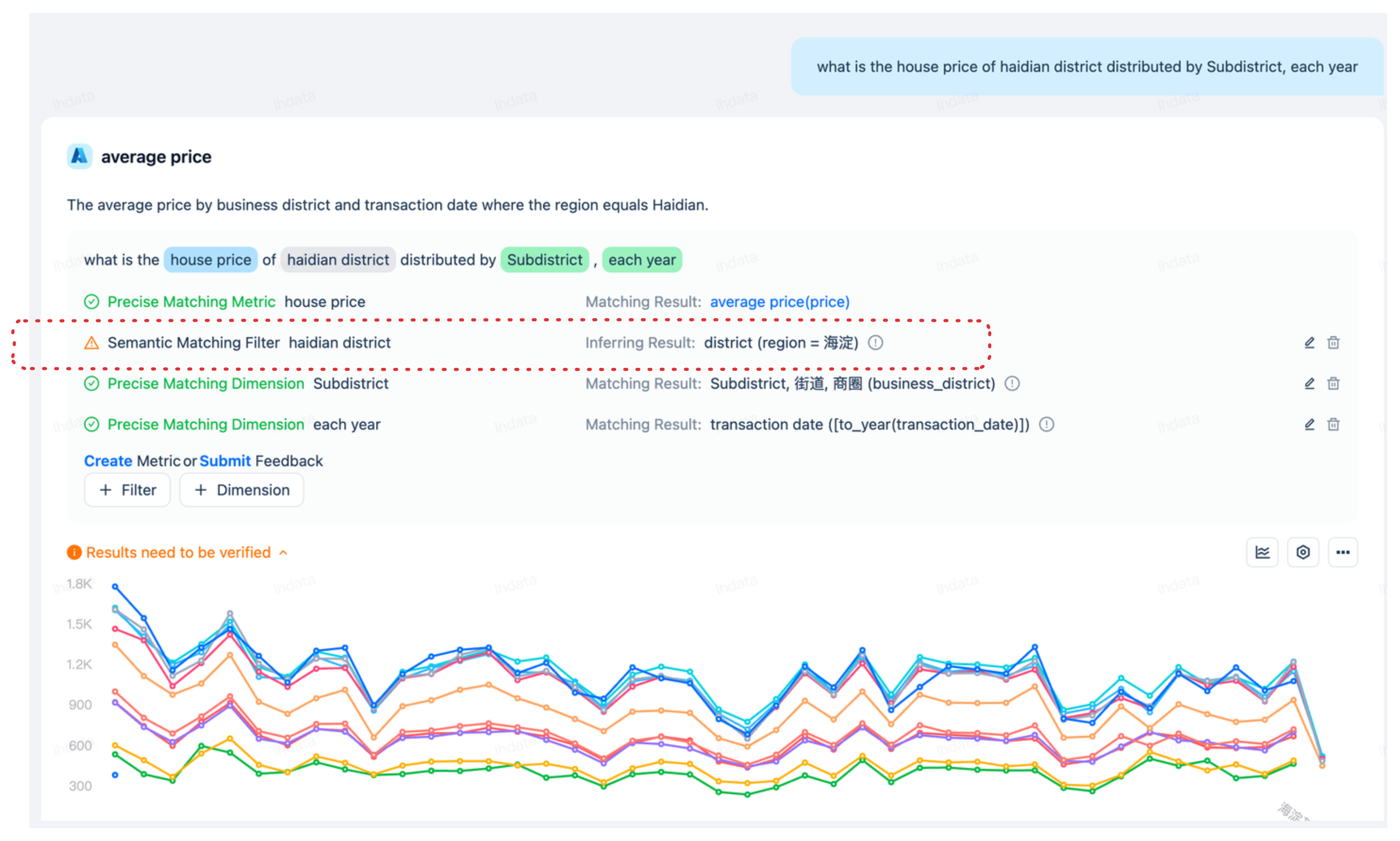 我们收到一条通知,指出“结果需要验证”。在调查详情时,我们发现查询涉及“海淀区”。DataGPT 是一款由大型语言模型(LLM)驱动的数据分析工具,它通过解读“海淀区”并将其与表中地区字段的中文值“海淀”相关联,巧妙地处理了数据的多语言特性。由于表中仅包含中文的地区信息,DataGPT 的推理能力使其能够识别这种对应关系,并无缝对齐数据以得出准确结果。尽管如此,该工具仍提示用户验证结果的准确性。