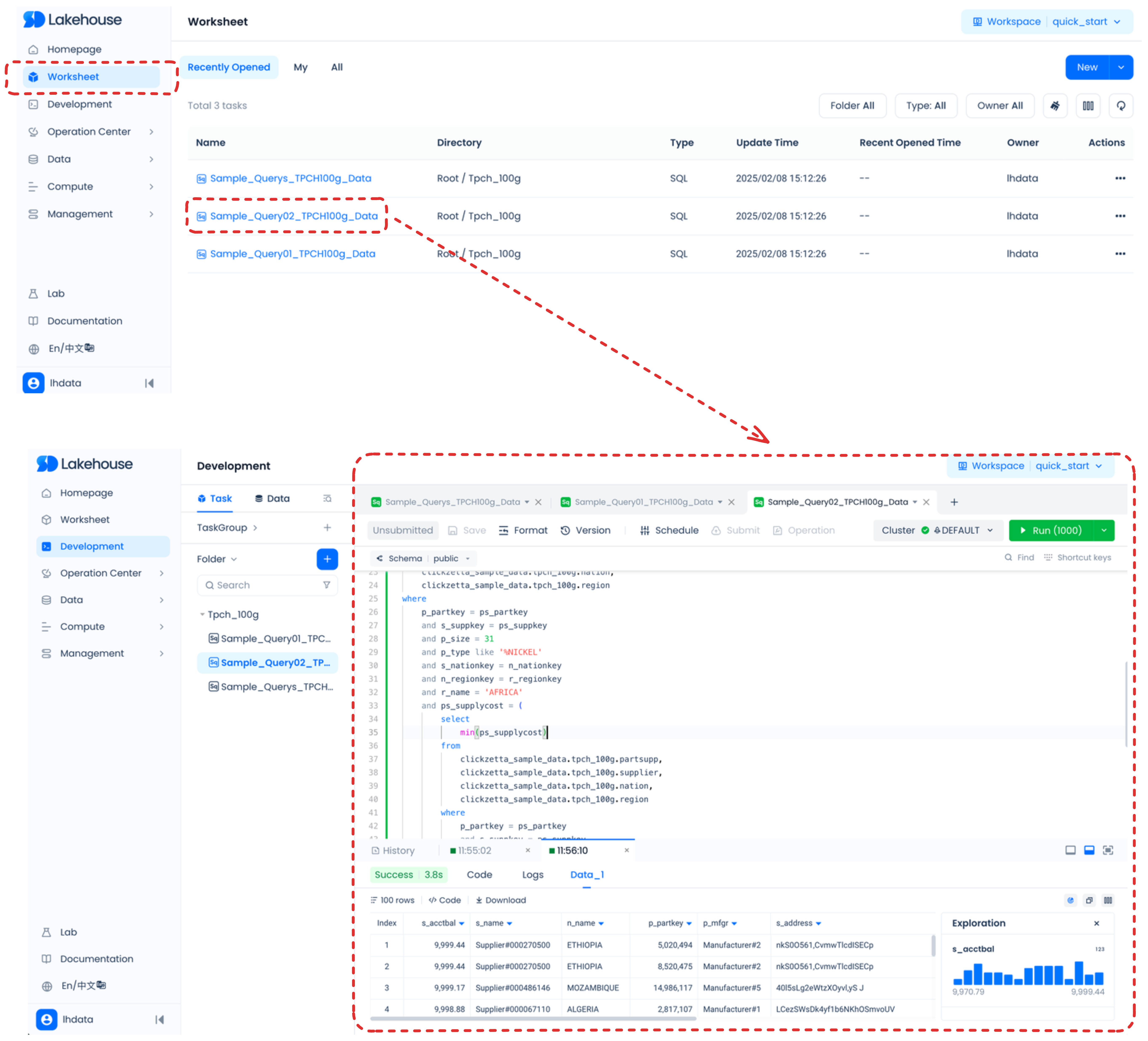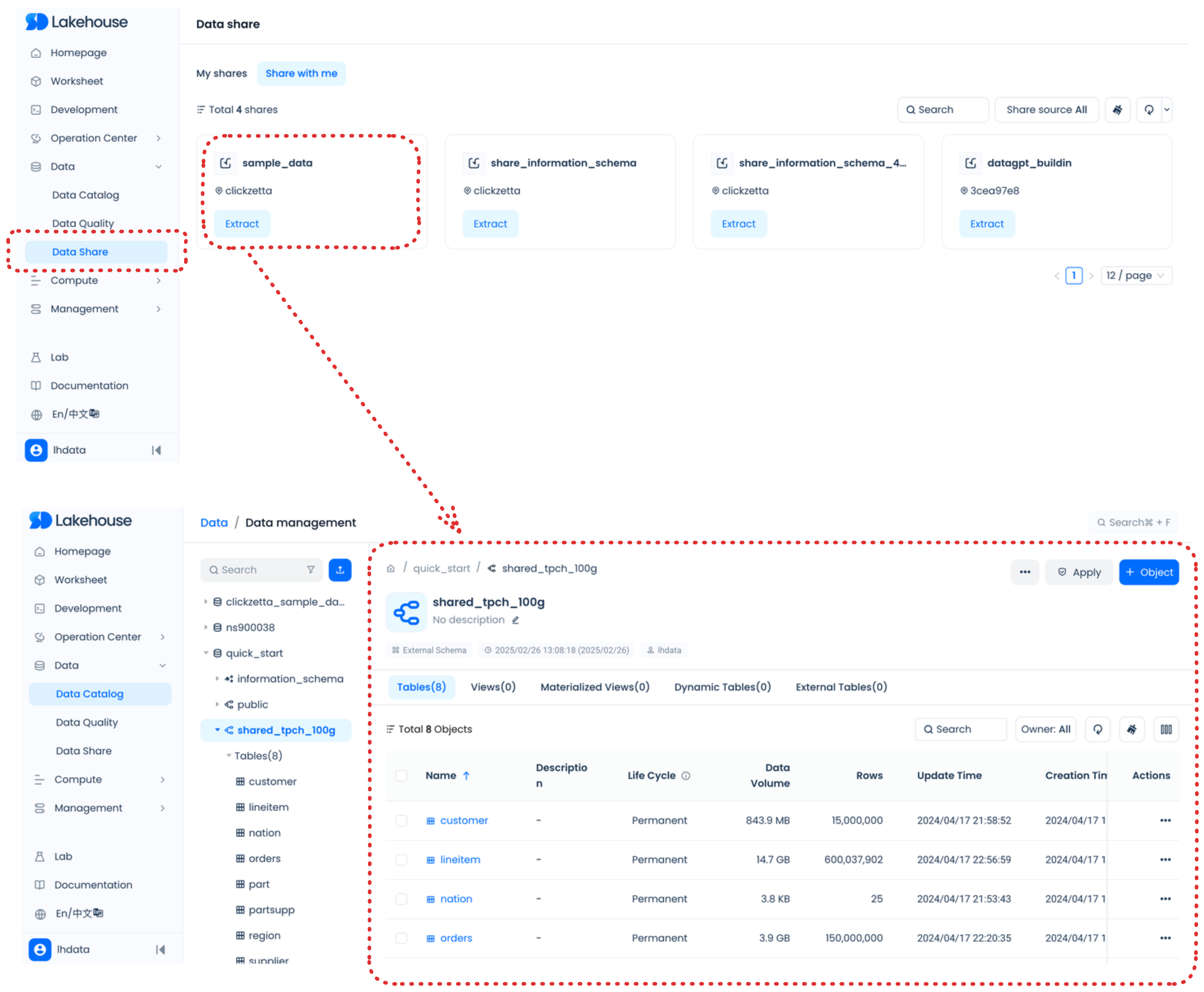 您可以在 Lakehouse Studio 中按照以下方式探索和管理您的数据湖/数据库对象: