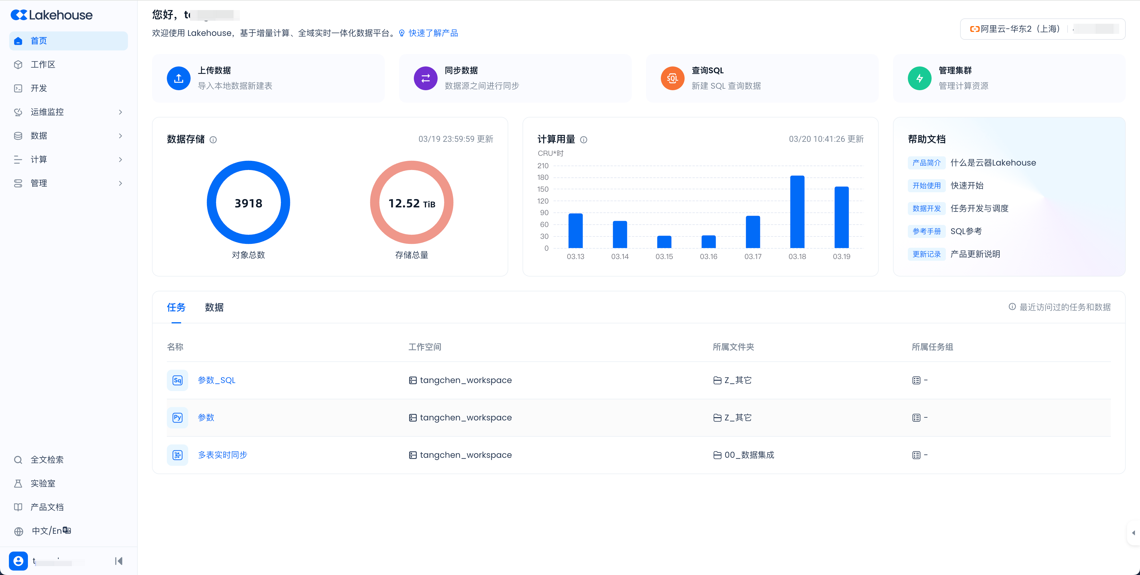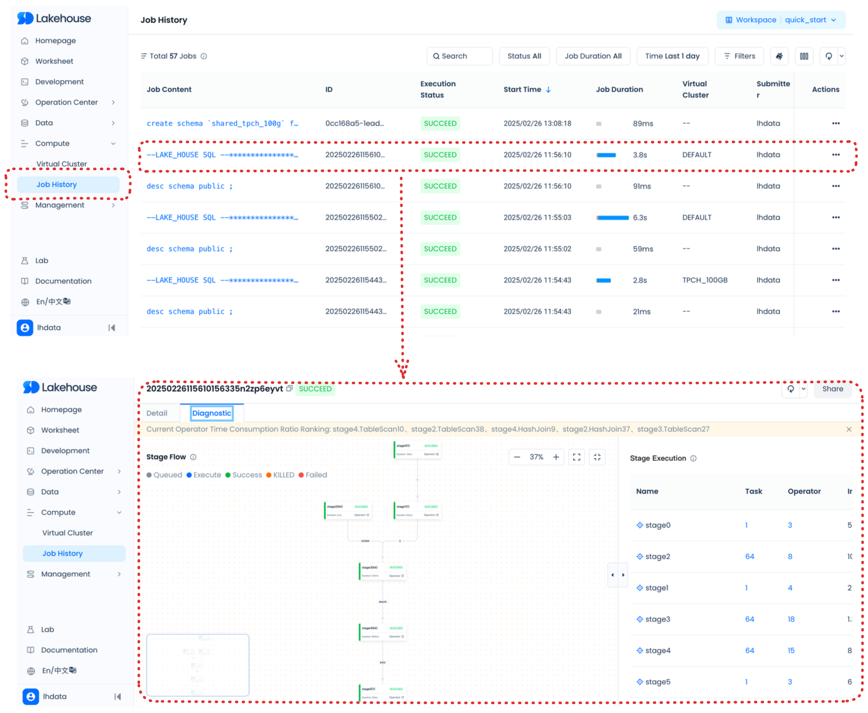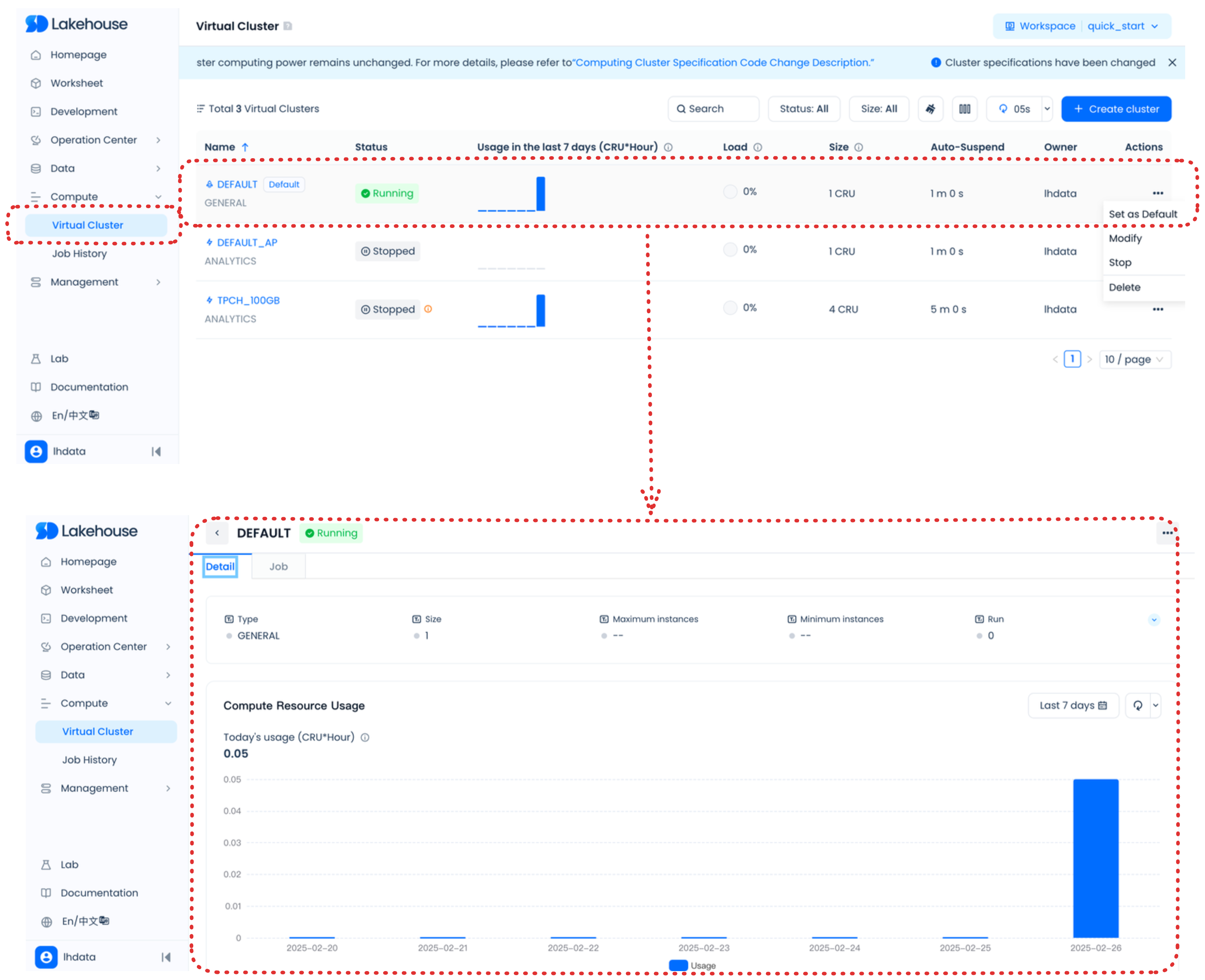 这些页面可帮助您了解 Lakehouse 数据使用情况,管理虚拟集群,监控虚拟集群中的任务队列,管理用户和角色,管理 Lakehouse 账户等。