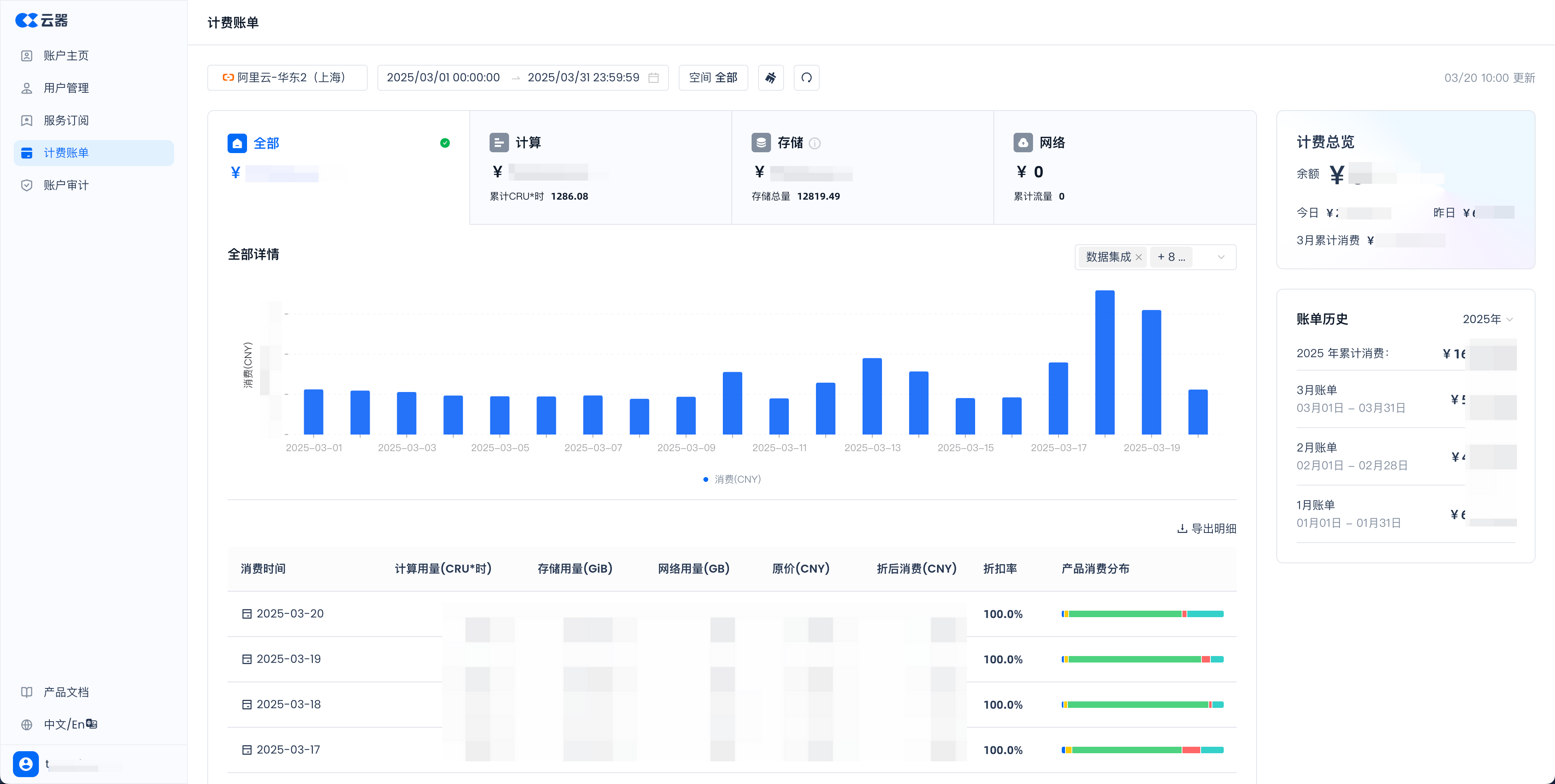 当您以具有账户管理员角色的用户身份登录时,可以在账户中心的计费功能下查看账户的使用记录(<your_accounts_name>.accounts.clickzetta.com/billing)。您还可以按 SKU 类型(如计算、存储、网络或特定 SKU)查询详细费用。