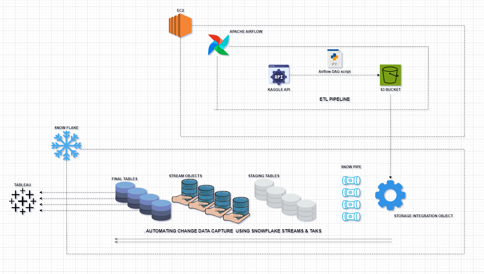 开发完该项目后,可以根据需求安排 Airflow DAG 运行,确保 ETL 流程以所需的频率执行。最终清理、规范化和转换后的数据将可在 Tableau 中进行实时可视化,从而获得最新的见解和报告。项目架构图如下:
