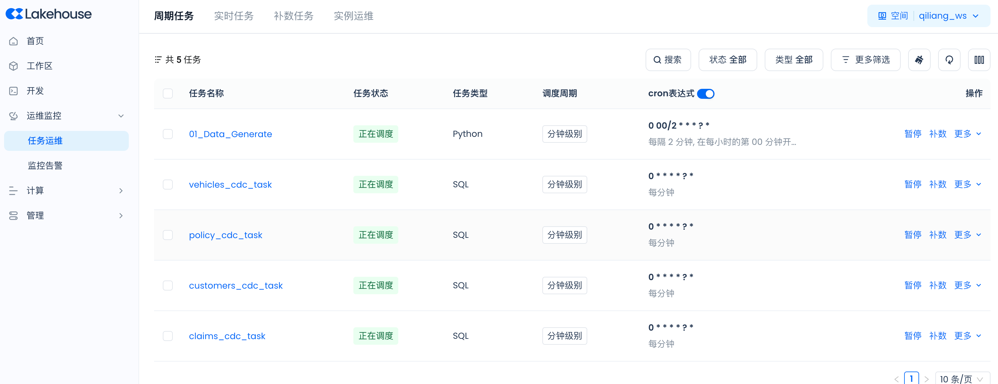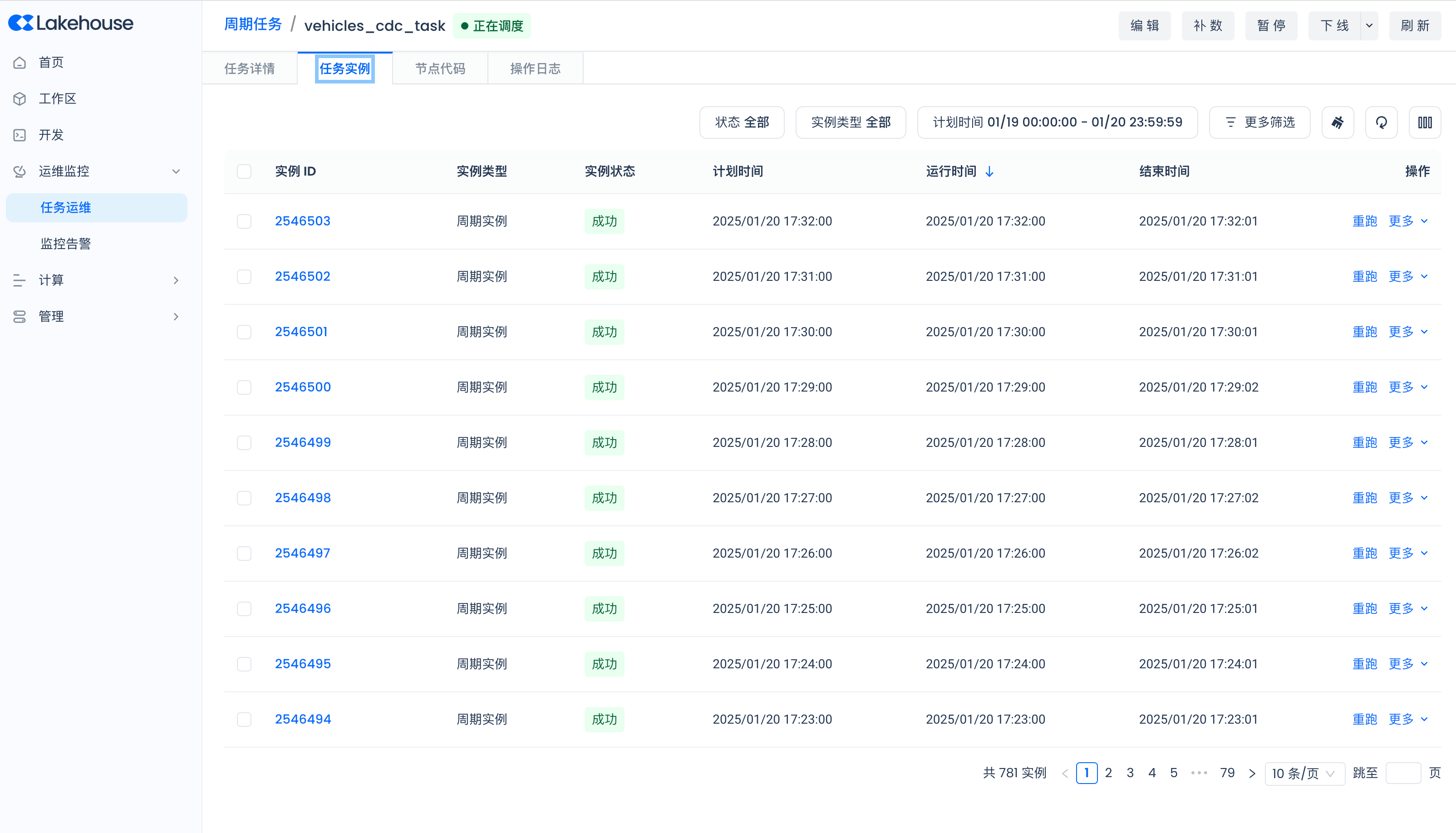 导航到Lakehouse Studio的运维监控->任务运维->周期任务,查看各个周期调度任务的运行状态:
