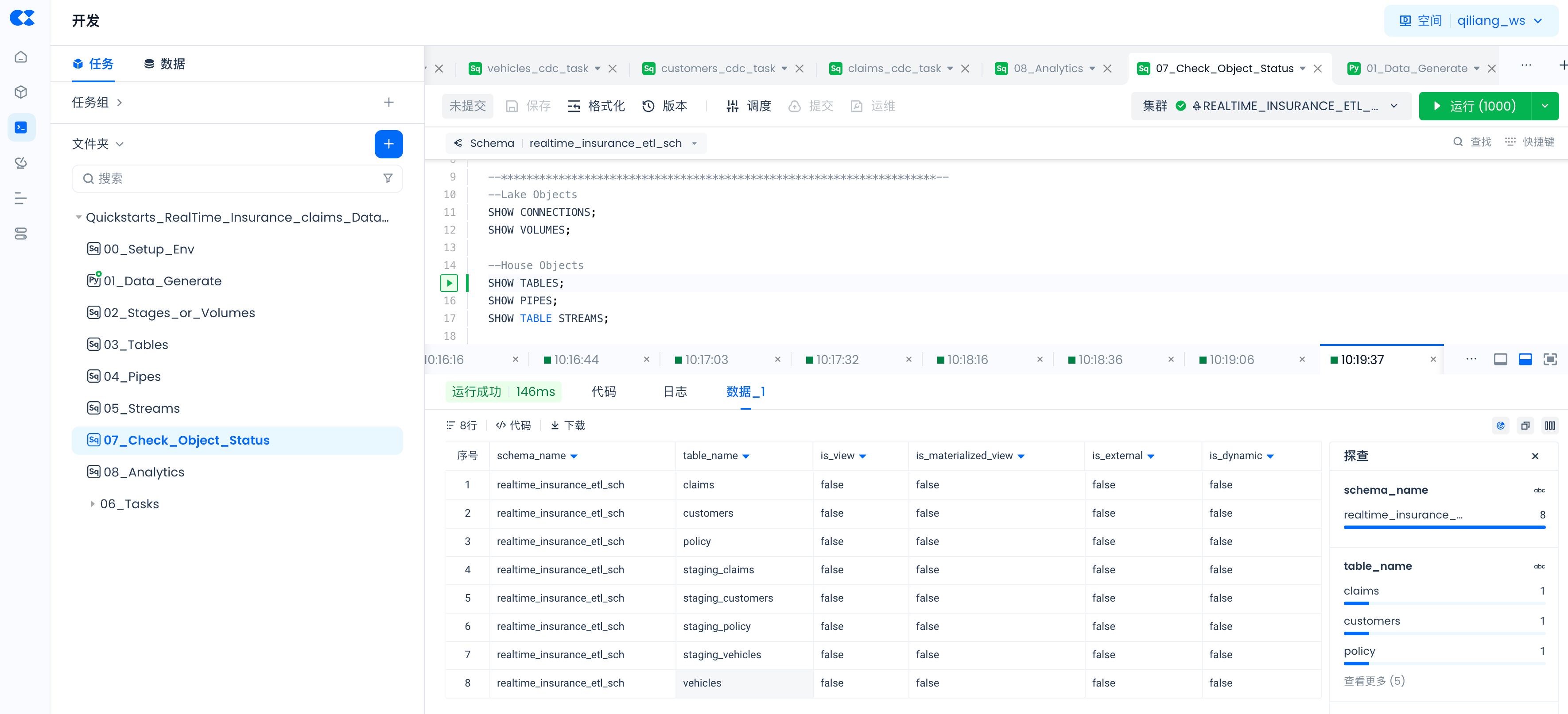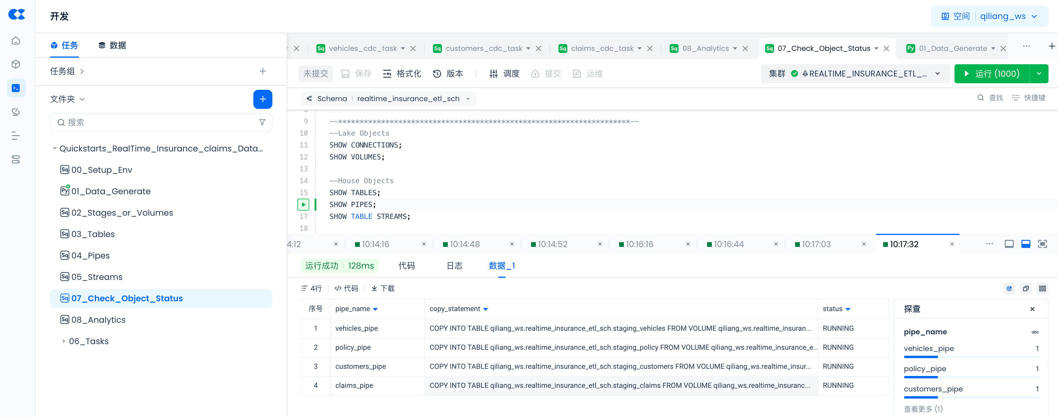 通过以下命令检查通过SQL命令创建对象是否已成功,以及PIPES的状态。