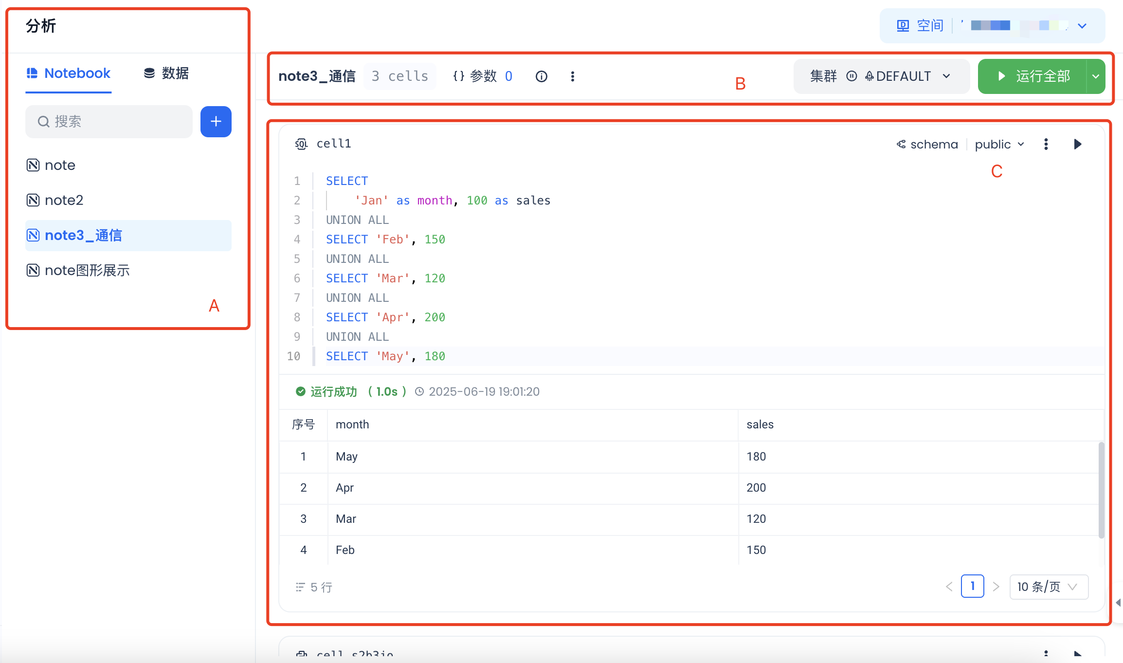 云器Notebook采用基于单元格命名的通信机制,每个单元格都有唯一的名称(如cell1、cell2等),可以直接在其他单元格中引用。