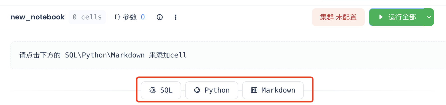 新建一个Notebook任务后,在操作区域点击不同单元类型创建具体的单元cell。