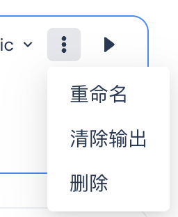 | 7 | ![]() | 单元格更多操作: 重命名:点击后重新对单元格进行命名 清除输出:将当前单元执行的结果进行情况。若有其他单元格中依赖该单元的输出,则可能会出现其他单元格执行失败的场景。 删除:删除该单元格。 |