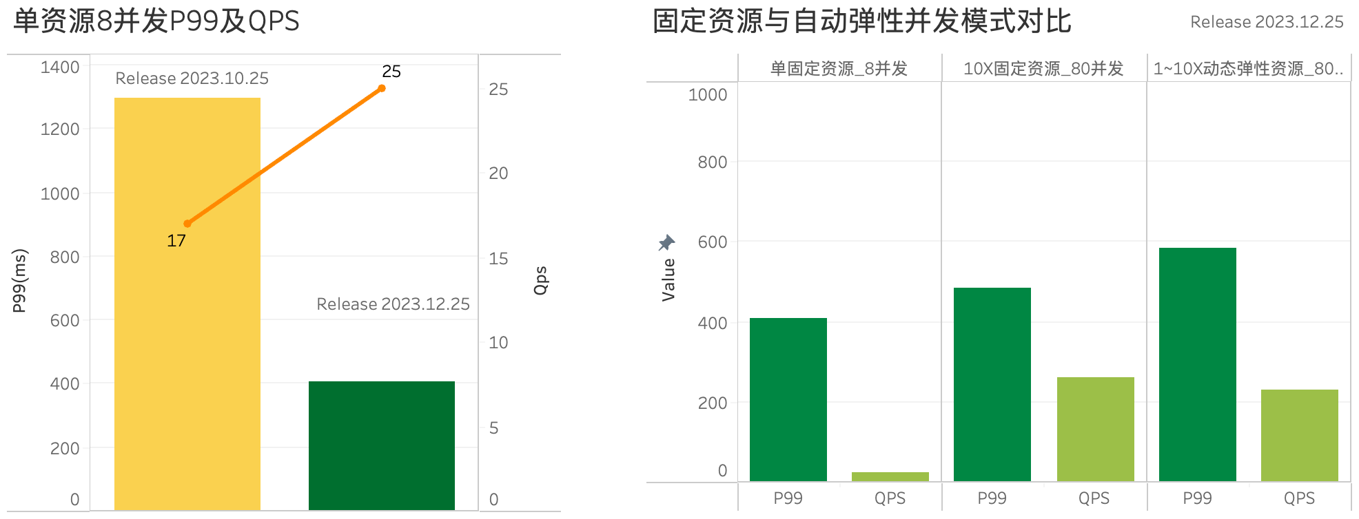 在多并发场景下,资源调度得到了显著增强,提升了并发查询性能和弹性扩容时的性能稳定性。与Release 2023.10.25版本相比,在SSBFlat 1G数据集上,单资源实例QPS提高了47%,P99查询时延降低了68%。此外,在自动横向弹性扩展(Concurrency Scaling)模式下,多并发查询的P99和QPS性能指标进一步接近按峰值规划固定资源的性能表现,有效降低了资源成本。