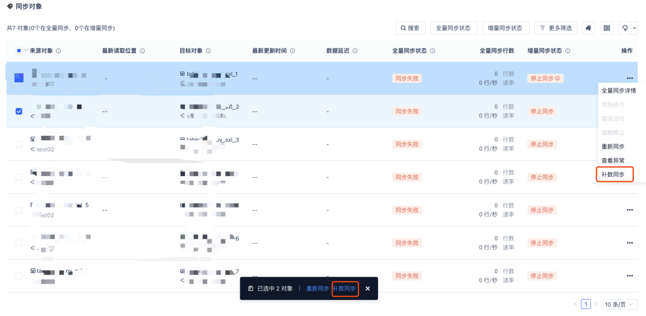 - 数据集成:实时同步,支持批量选择表操作按租户补数