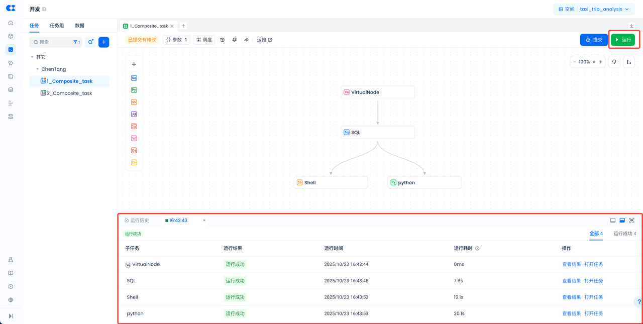 任务开发:组合任务支持手动触发临时运行,提供提交发布到生产环境调度运行前的测试能力。