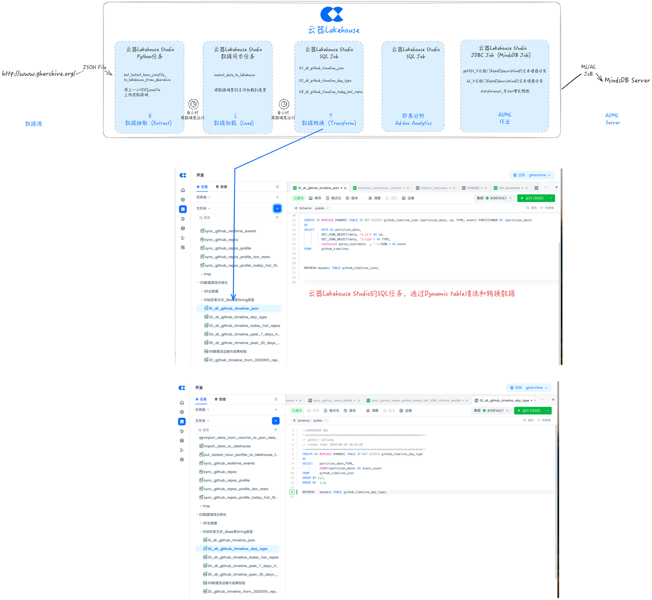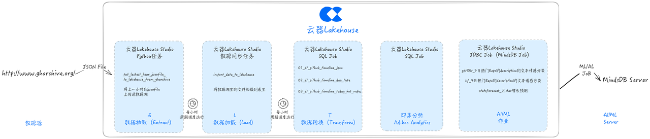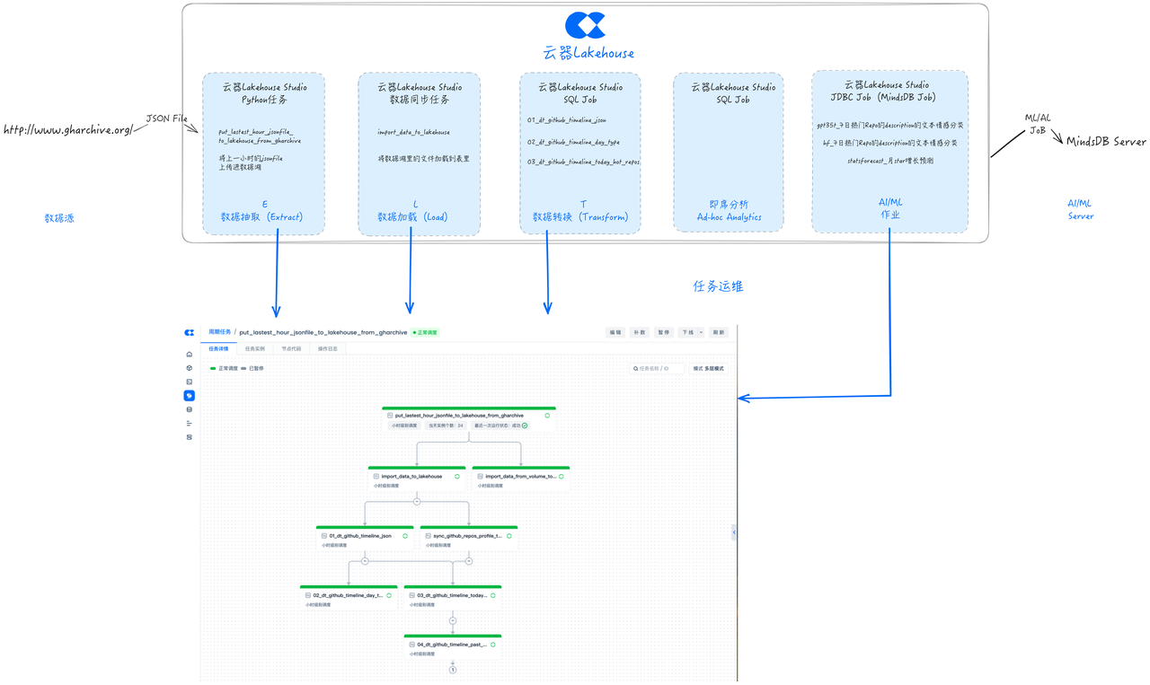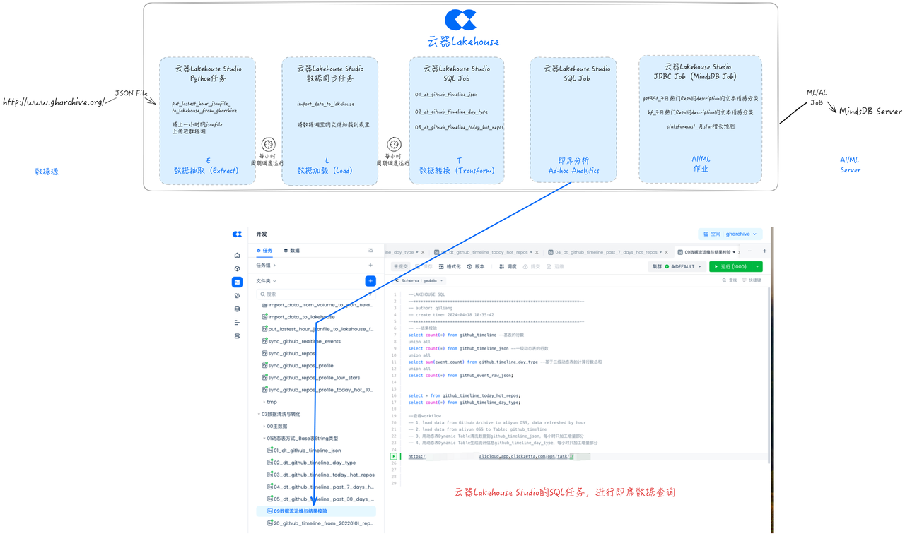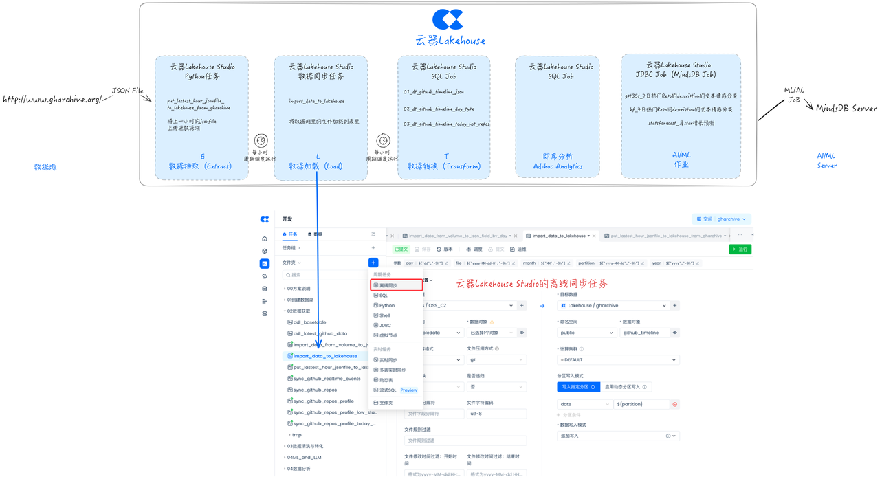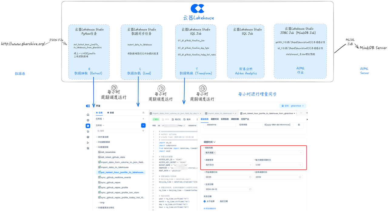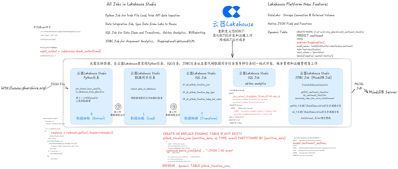 本文讨论了在数据项目中,特别是与 ML、AI 关系紧密的数据项目中,传统开发方式存在的问题与挑战,以及如何通过云器 Lakehouse 实现 GHArchive ELT 的新方式,进行统一的开发、调度和运维,显著精简方案中的产品组件,帮助大幅提升效率和节约管理成本。关键要点包括: