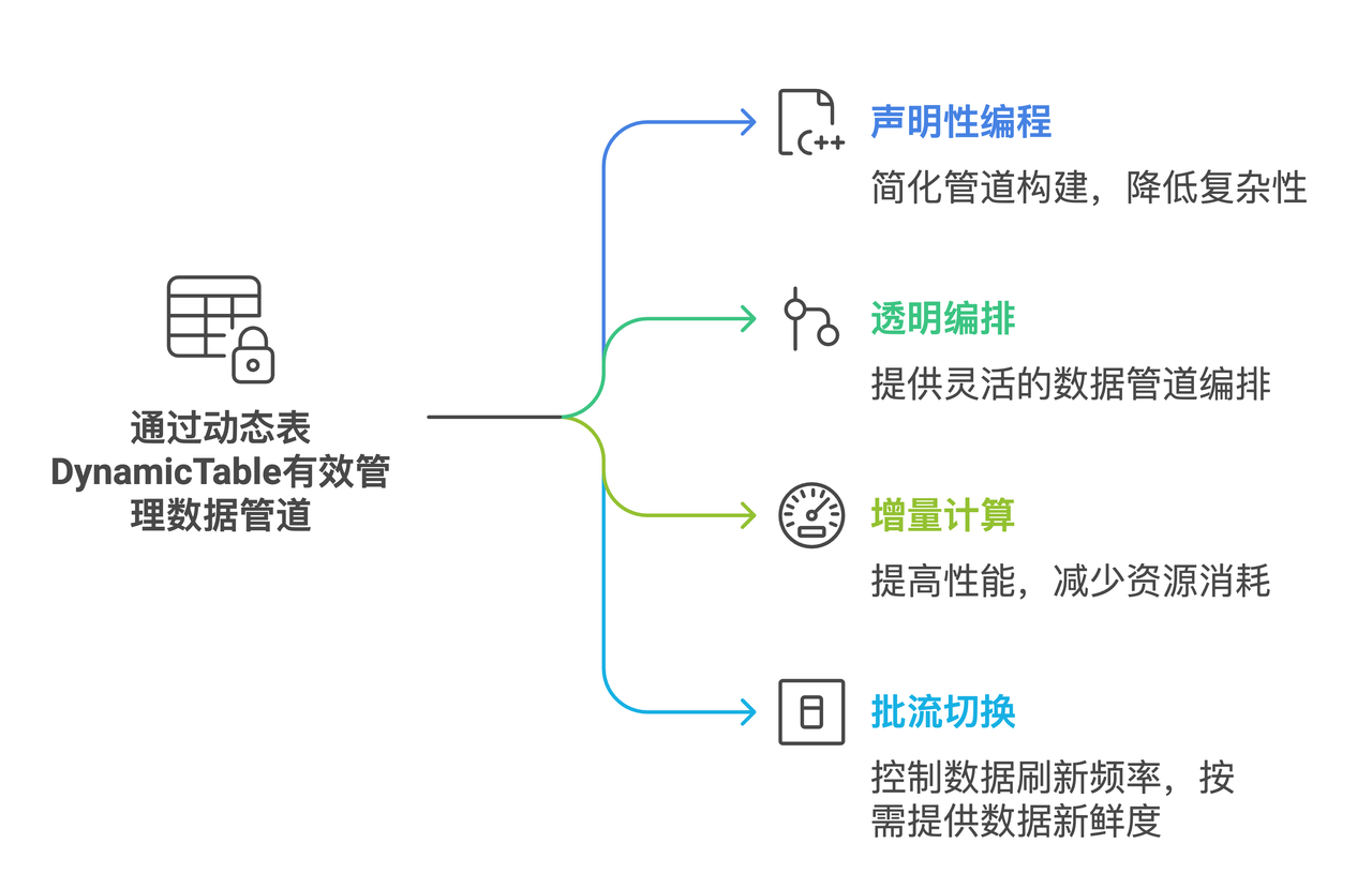 声明性编程:用声明性 SQL 定义管道结果,不用再考虑中间表逻辑,降低复杂度。