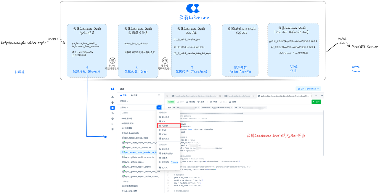接下来我们通过云器Lakehouse Studio开发一个Python任务,将数据从GH Archive网站抽取到数据湖存储(本方案采用阿里云OSS)上。