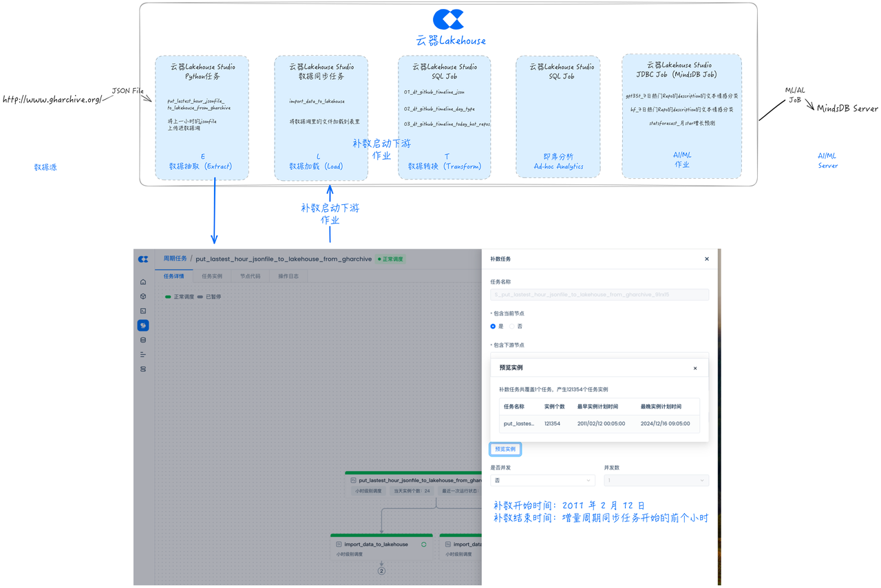 对于补数据任务,在云器Lakehouse Studio里,和增量任务可以完全复用,只需要按照全量数据的开始和结束日期配置和执行补数任务即可,来回刷历史存量数据。