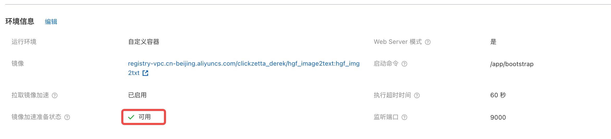 - 在函数列表中,进入已创建函数->函数配置,查看镜像加速准备状态, 等待至 "可用"