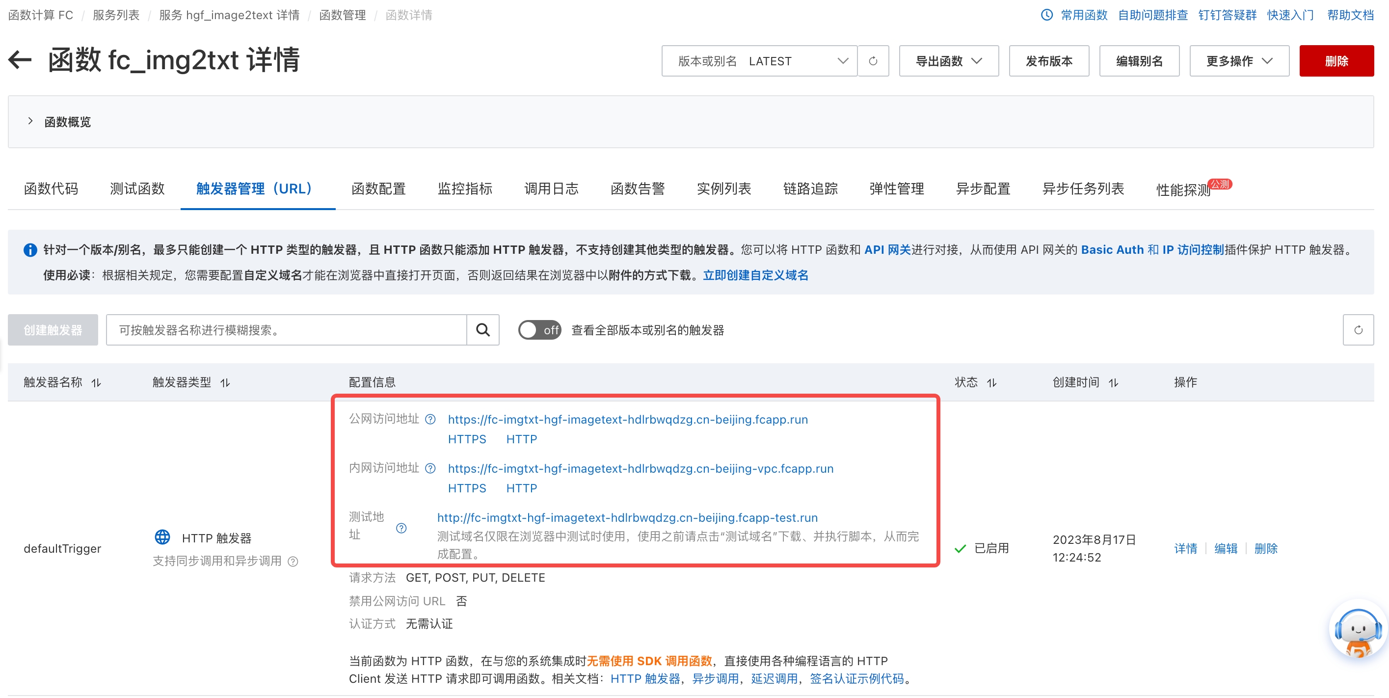 - 进入触发器管理,获得公网访问地址的 HTTP 链接