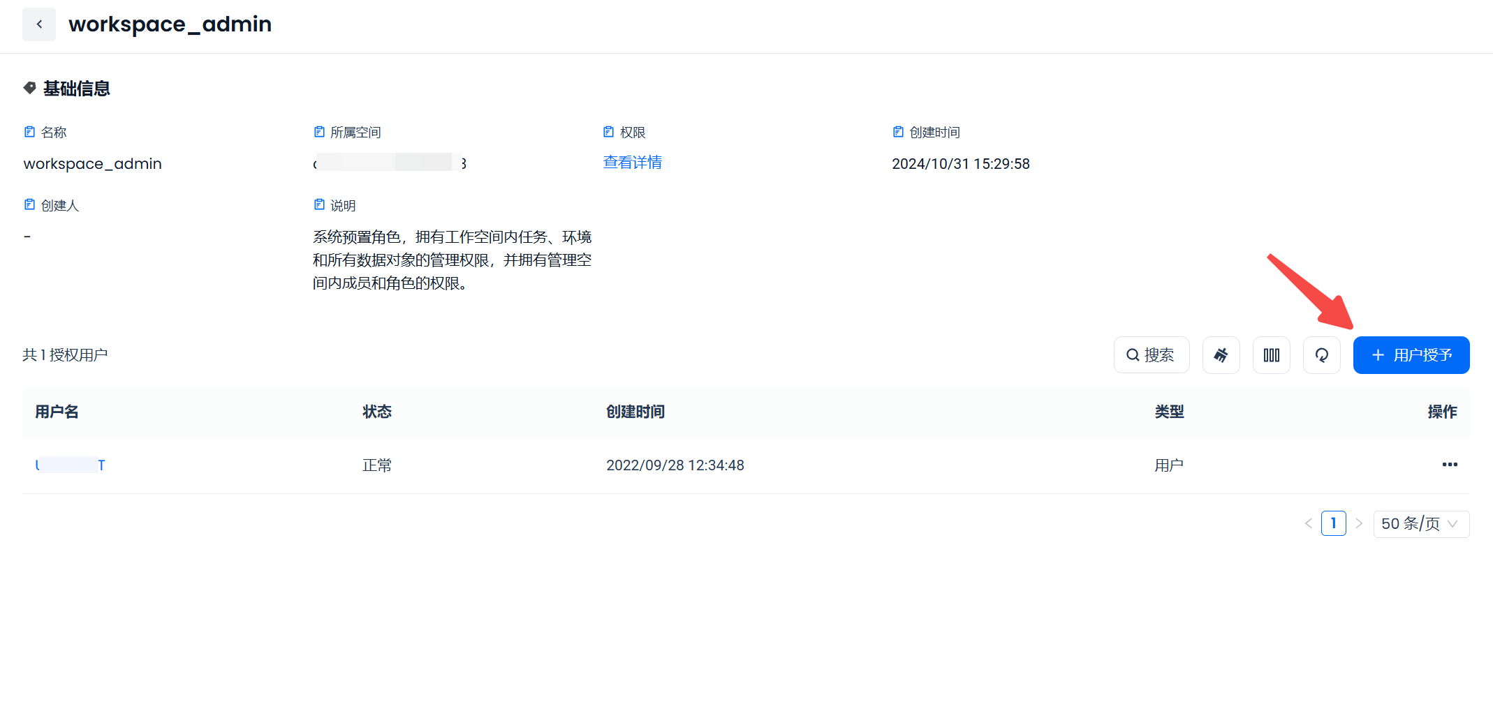 创建工作空间(workspace)的用户默认拥有该工作空间的"工作空间管理员(workspace_admin)"角色,该角色具备管理工作空间内的所有权限。每个工作空间内至少需要有一名用户被授予工作空间管理员角色,可以有多个用户被同时授予。