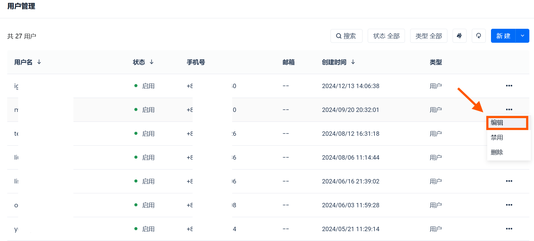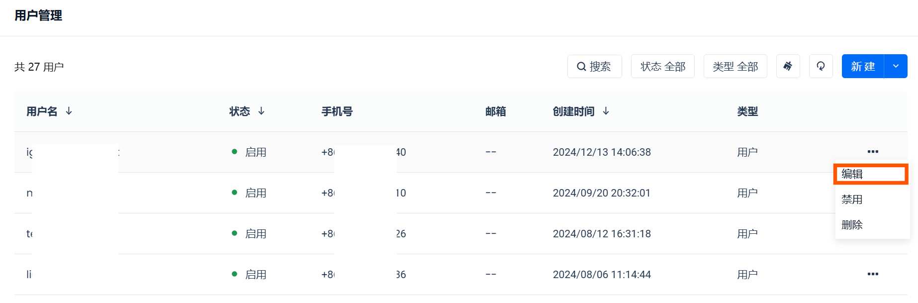 在“用户管理”页面点击需要编辑用户右侧的“...”,展开操作栏,并点击“编辑”按钮,即可编辑用户信息。仅可修改用户的邮箱信息以及配置该用户是否为”账户管理员“角色。为保障系统安全,账户管理员不可修改其他用户的密码和手机号信息。