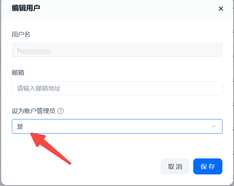 3)账户管理员可以移除其他用户“账户管理员”的角色。与授予账户管理员角色操作类似,在用户的“编辑”弹窗中,将“设为账户管理员”一栏中选择“否”即可移除。
