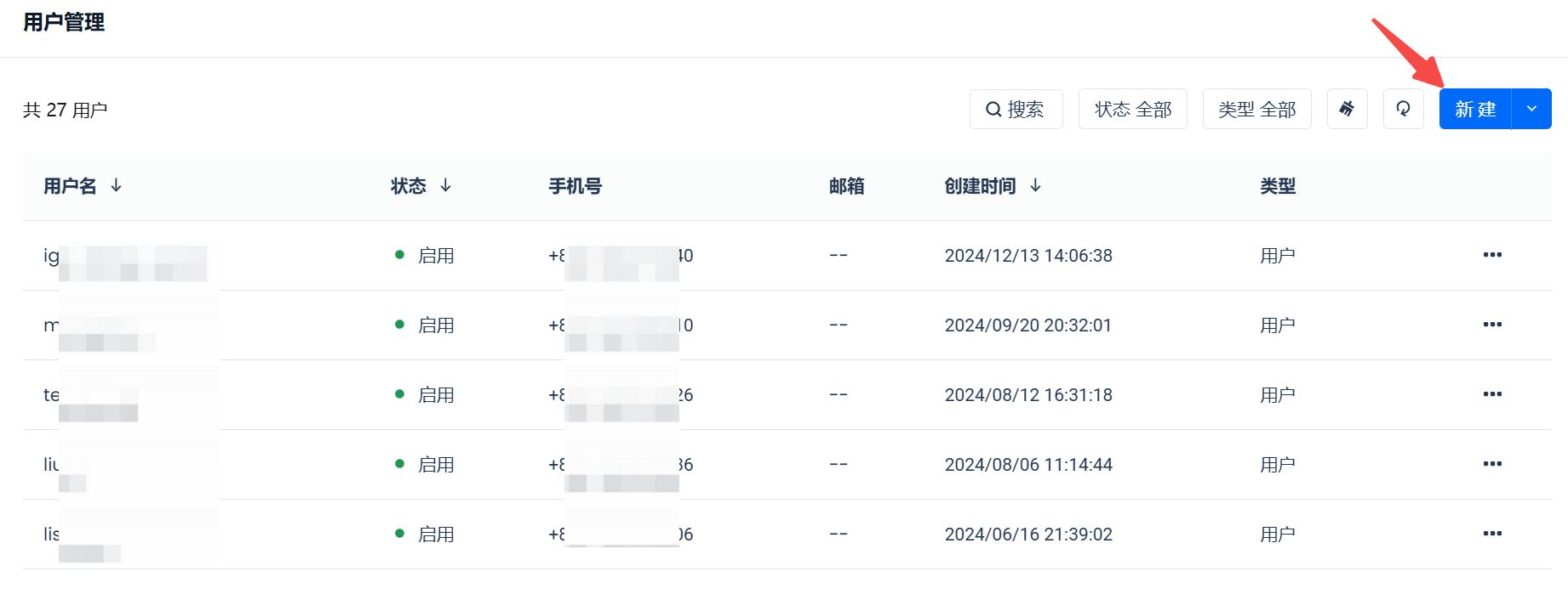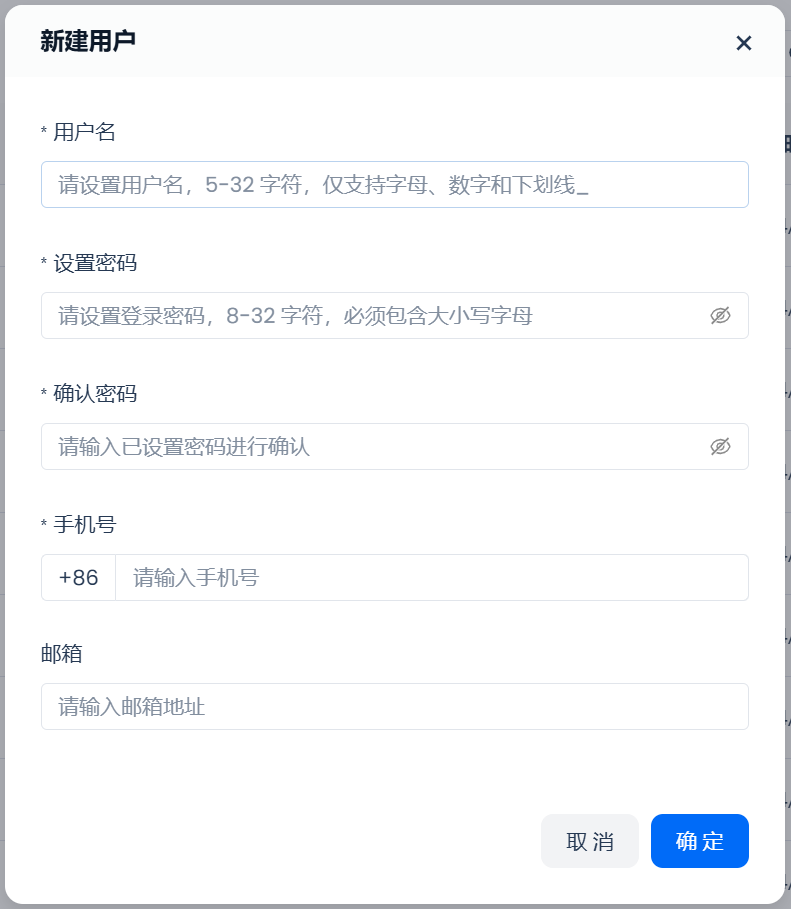 使用具备账户管理员在”用户管理“页面点击”新建用户”按钮,填写需新建的用户名、密码和手机号等信息后,即可新建全局用户。