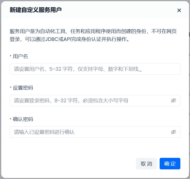 使用具备账户管理员角色的用户在”用户管理“页面点击”新建自定义服务用户”按钮,填写服务用户的用户名和密码即可新建自定义服务用户。