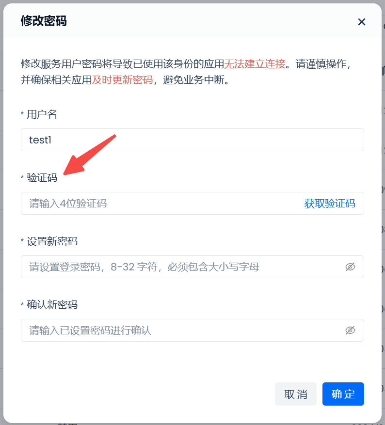 具备“账户管理员”角色的用户可以修改服务用户的密码。由于修改自定义服务用户密码属于敏感操作,需要验证当前登录用户的手机号,在正确输入手机号验证码后才可修改。
