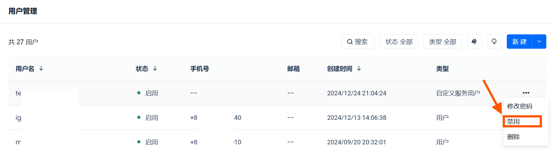 仅账户管理员角色的用户可以禁用服务用户。在“用户管理”页面,点击需要禁用的服务用户右侧的“...”,展开操作栏,并点击“禁用”按钮,二次确认后即可禁用该服务用户。