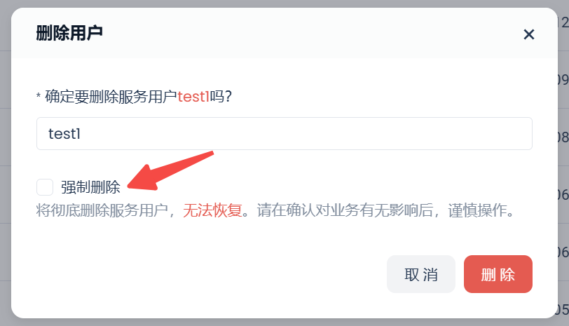由于服务用户身份通常被关联在系统调度任务或其他应用任务中,删除正在使用的服务用户身份可能导致生产任务中断、造成故障,因此删除服务用户弹窗提供了是否“强制删除”的勾选框: