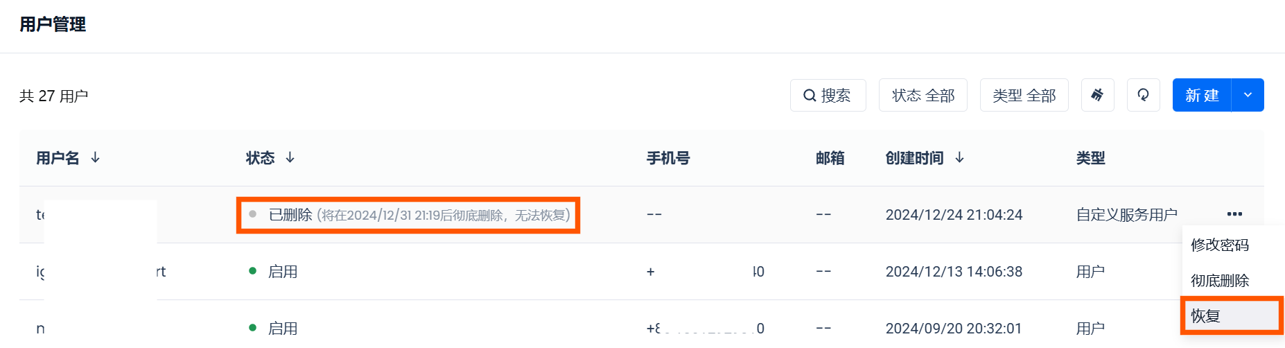- 如不勾选“强制删除”,则该服务用户身份将被“软删除”,所有使用该服务身份进行的任务将中断。但该服务用户仍将保留24小时,在24小时内可通过点击“恢复”按钮恢复该服务用户身份为“正常”状态。恢复后,使用该服务用户身份的任务可重新正常执行(如无重试或超过重试次数需要手动启动)。24小时后,该服务用户身份将永久删除,不可恢复。