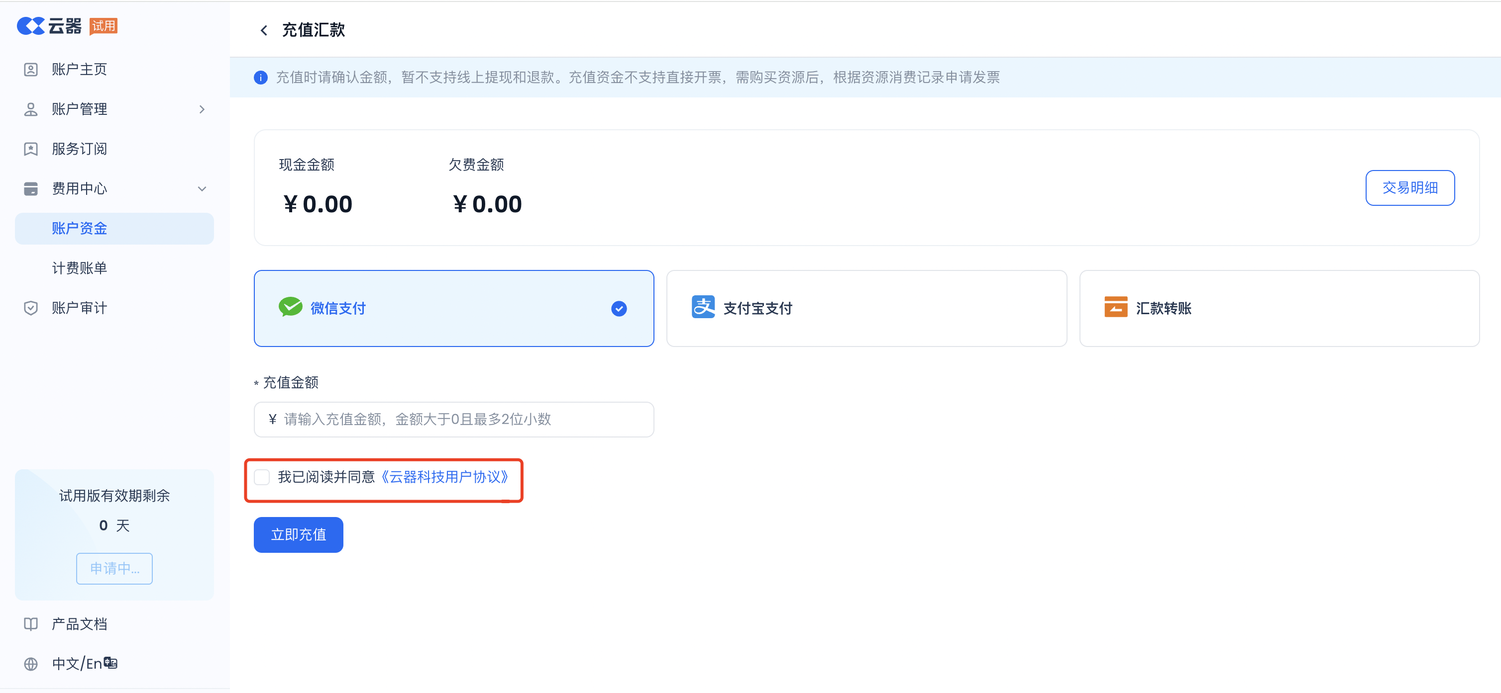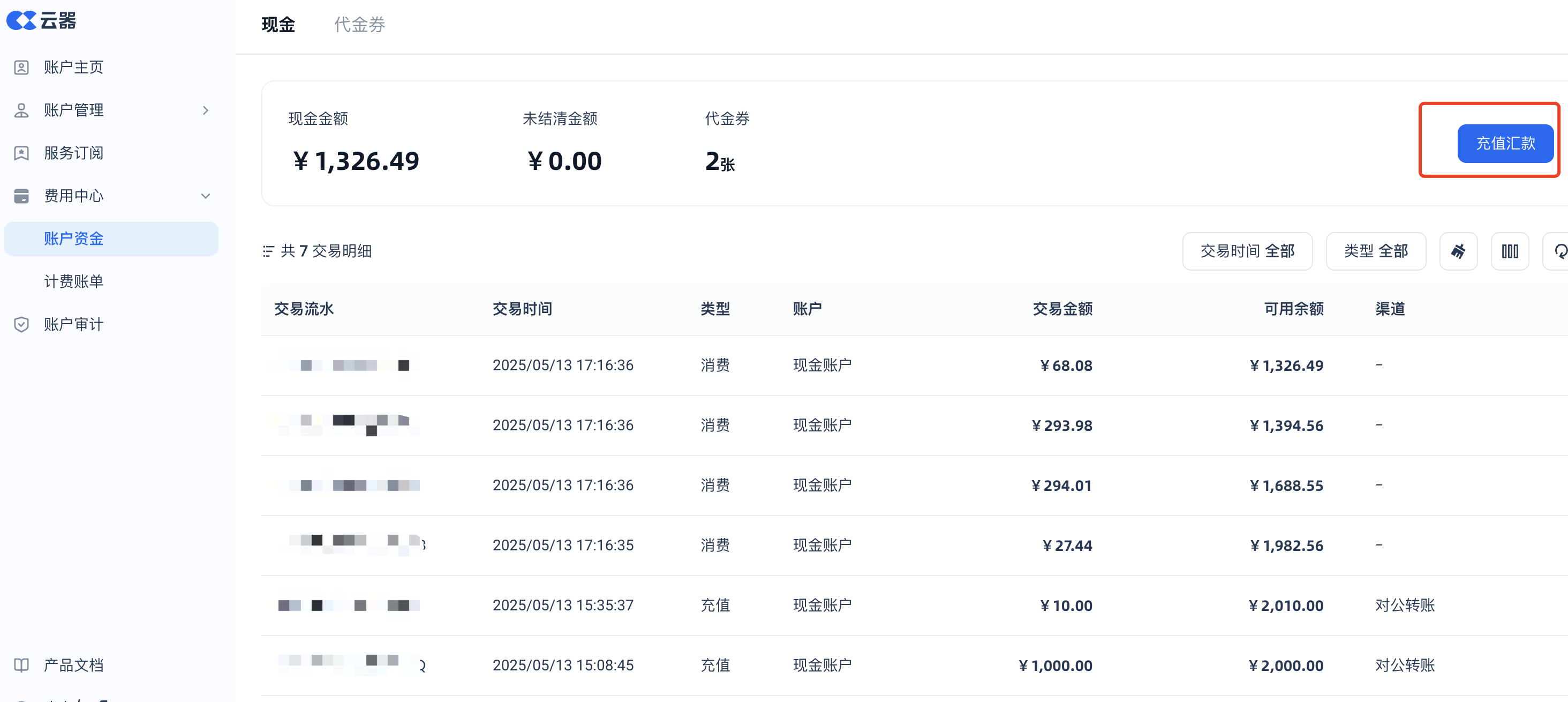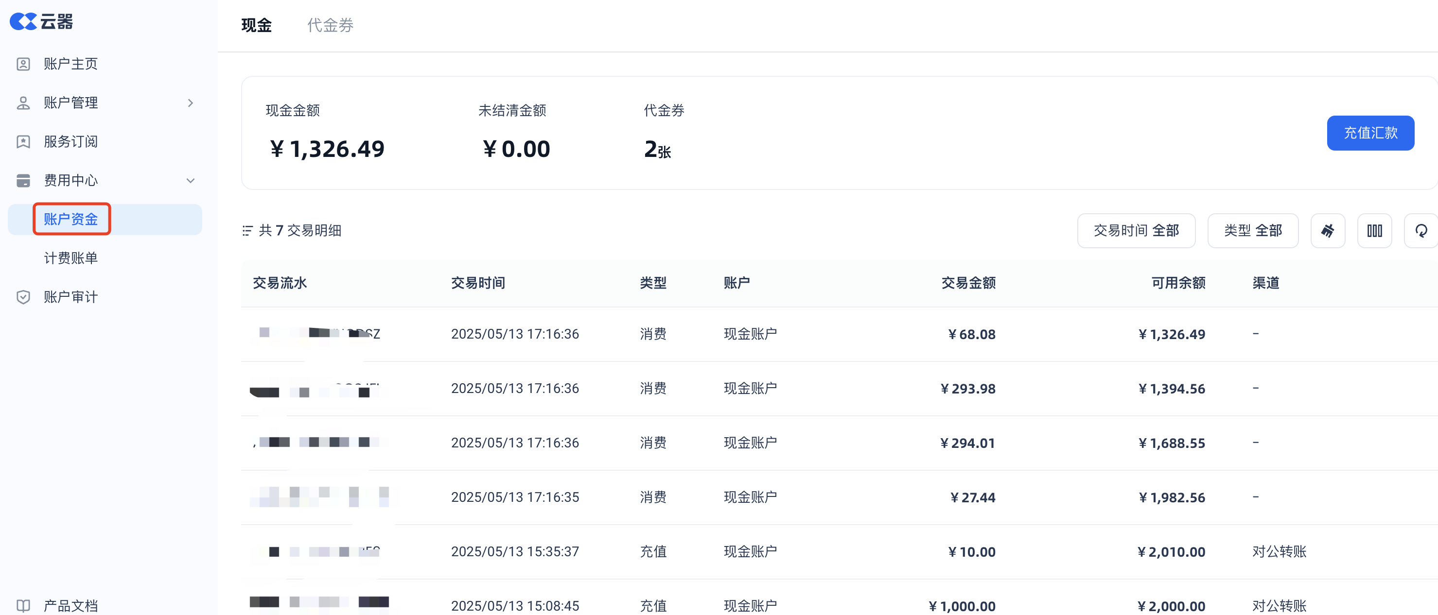 - 现金账户:可以通过对公转账、微信、支付宝线上充值的方式预充值资金