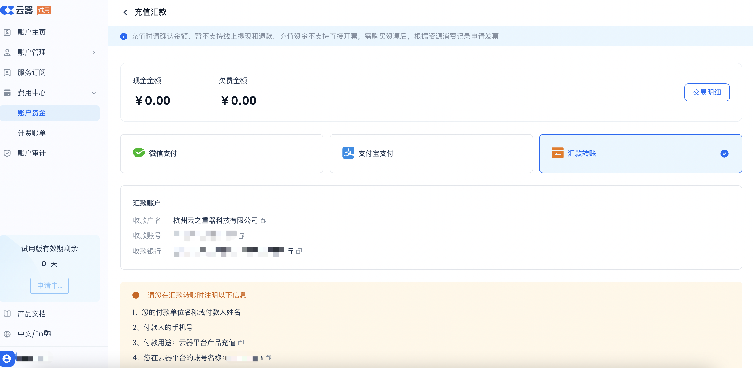 对公转账 | 需要使用开户名与云器租户实名认证主体一致的银行账户进行汇款;可选择通过网银、手机银行客户端、银行柜台等方式将款项汇款至云器的对公账号中;汇款后需联系您对应的商务充值至您的云器现金账户中。 | 3个工作日 |