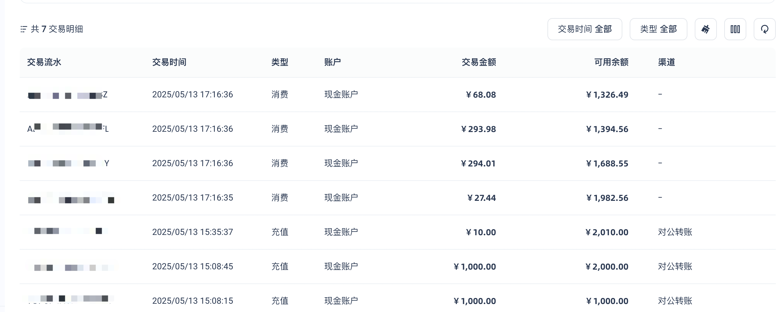 - 渠道:交易发生渠道,针对充值类型交易,记录充值来源渠道,例如:对公转账、微信、支付宝