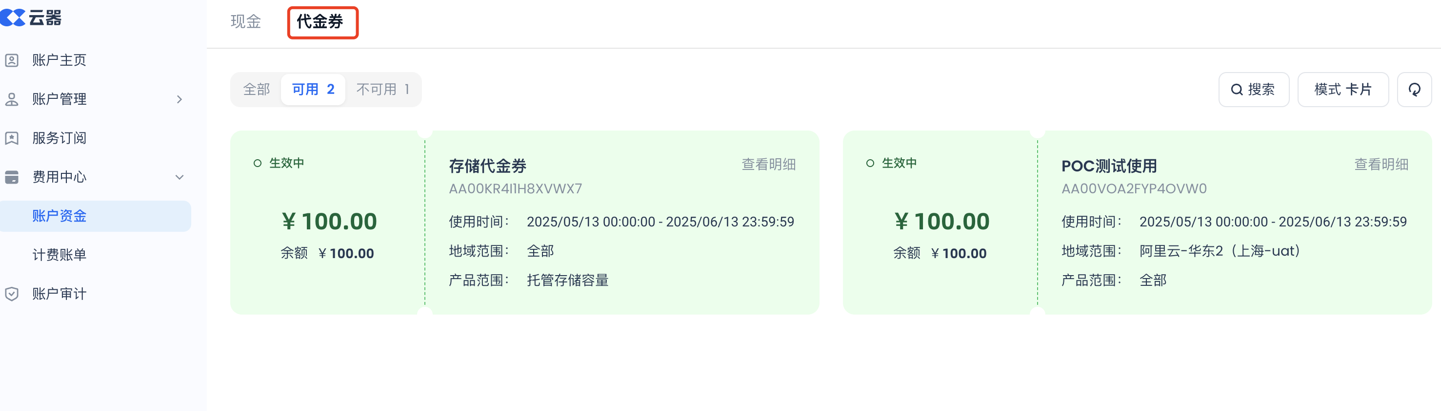 账户资金页面顶部点击“代金券”进入代金券页面,默认展示租户当前可用代金券,可切换至“全部”、“不可用”查看对应状态代金券,如下图: