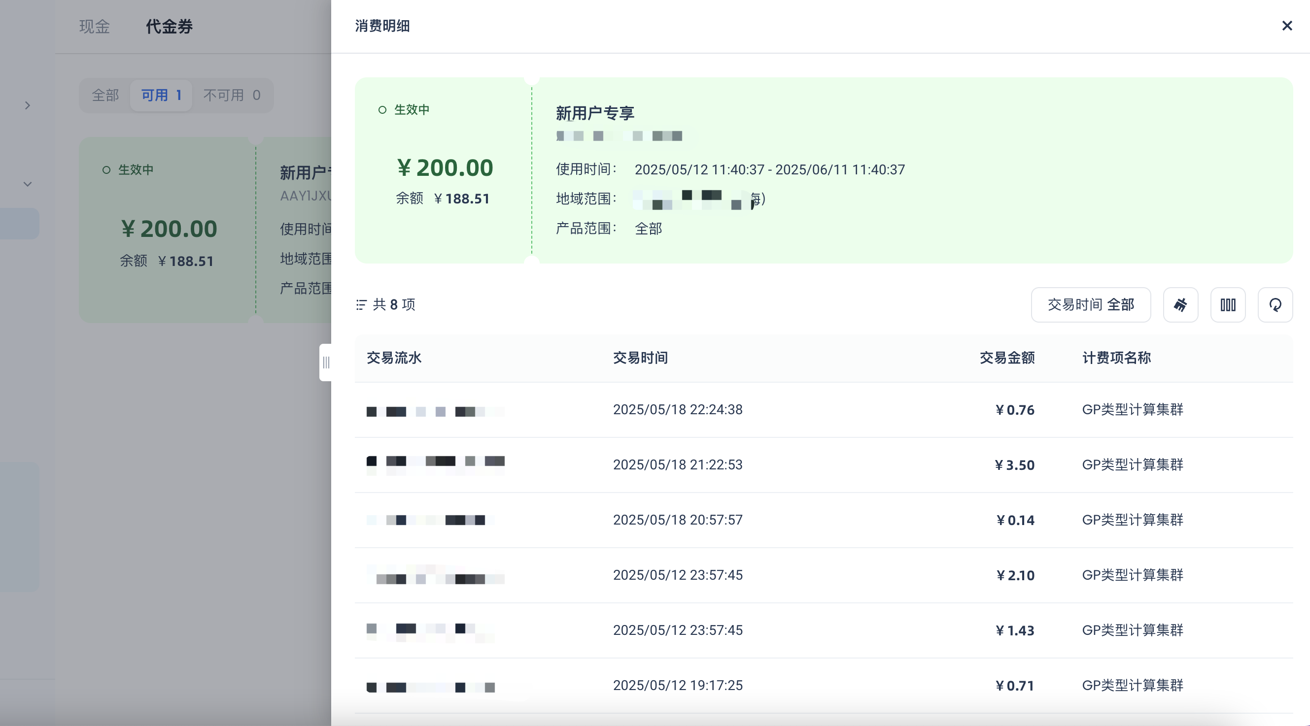 - 交易明细:涵盖代金券消费记录,以计费项维度展示抵扣记录,支持通过交易时间筛选