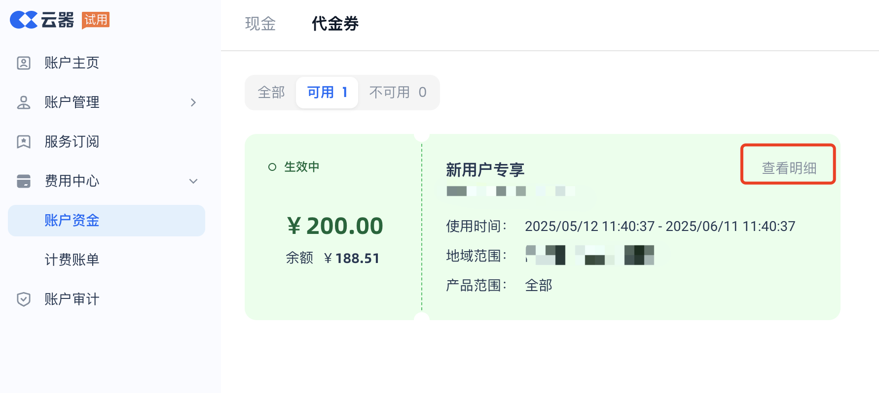 - 地域范围:代金券支持抵扣的实例归属的region范围