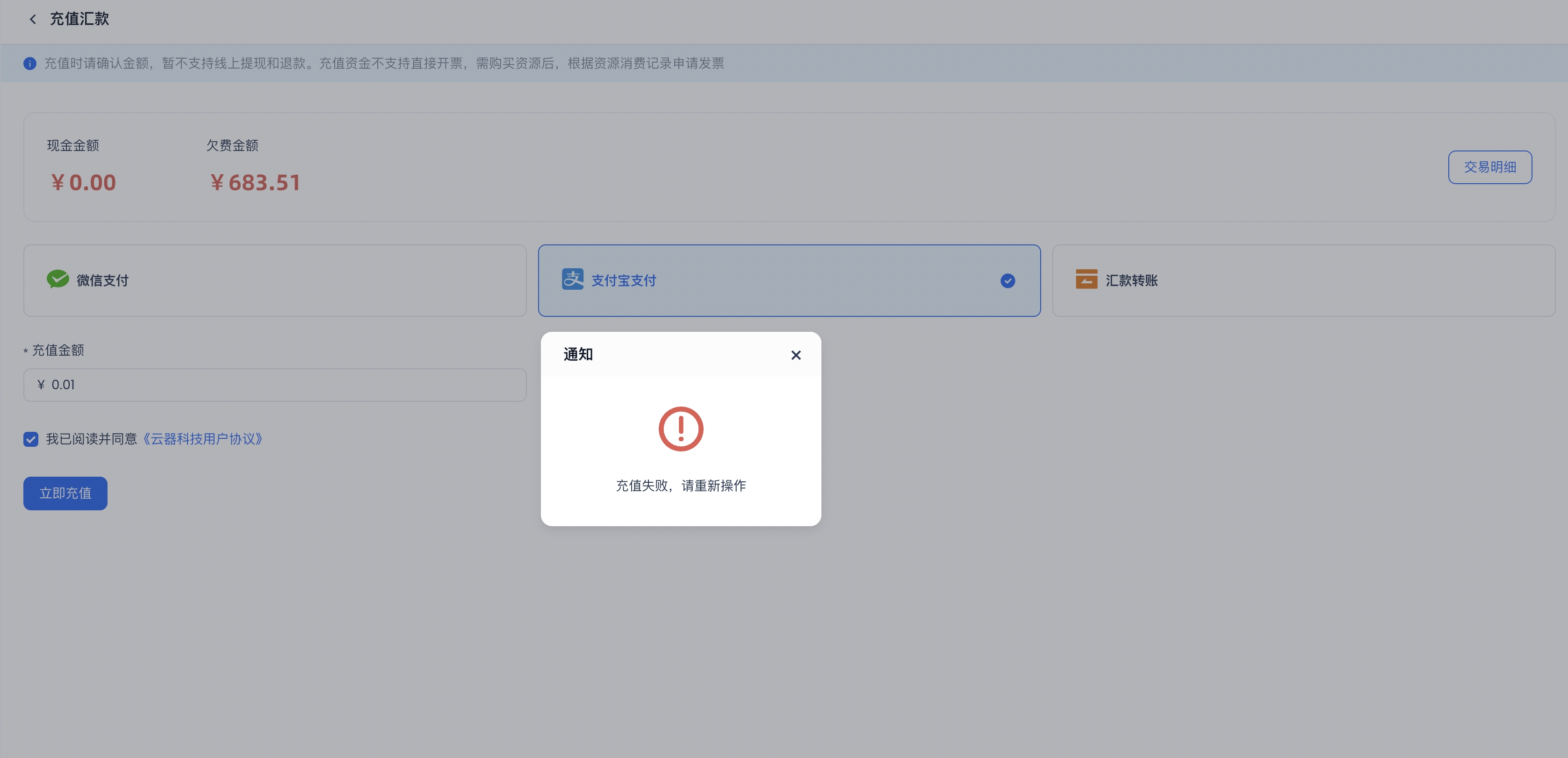异常情况:若选择线上充值,但超时未完成支付,将提示充值失败,如下图,此时需要您刷新页面后重新发起充值。