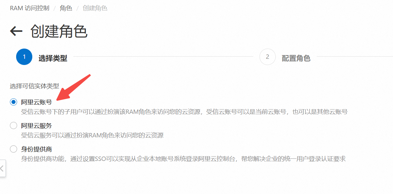 首先,需要在阿里云访问控制页面(https://ram.console.aliyun.com/roles)点击“新建角色”,并选择可行实体类型为:阿里云账号: