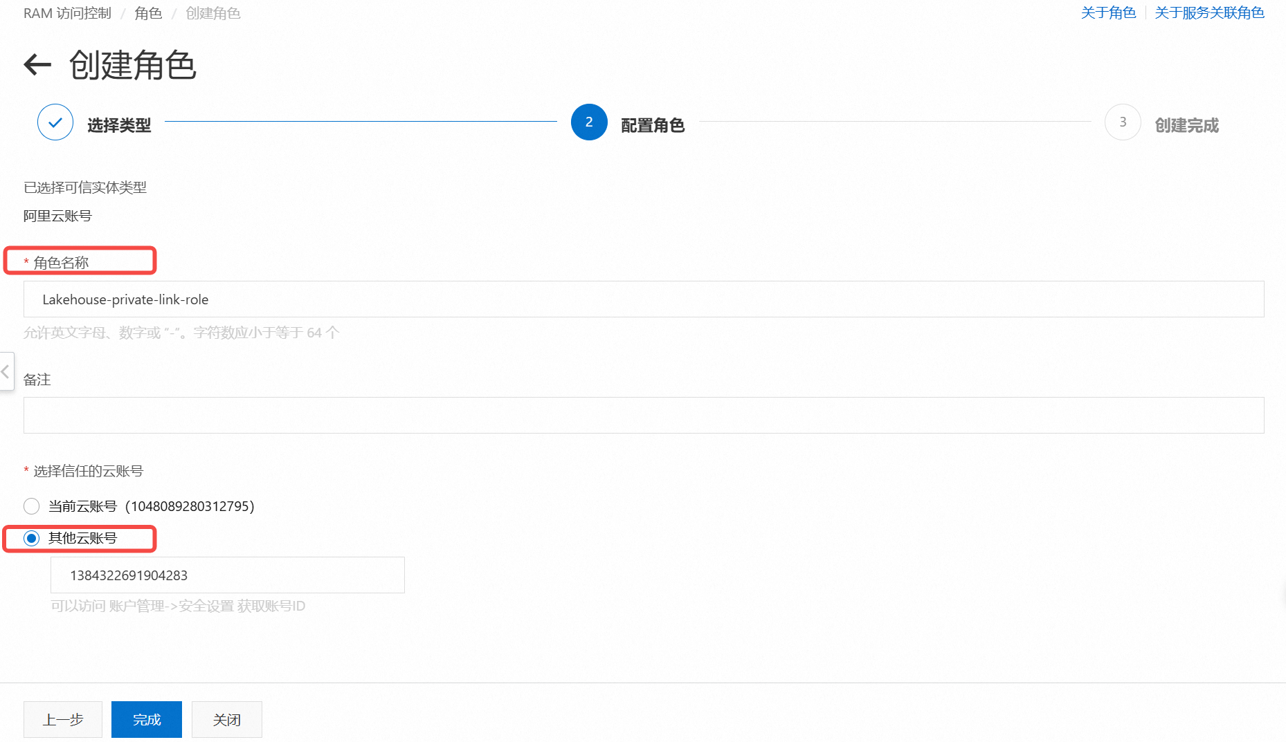 在“选择信任的云账号”中选择“其他云账号”,并复制Lakehouse 终端节点服务的LakehouseUID内容填入。