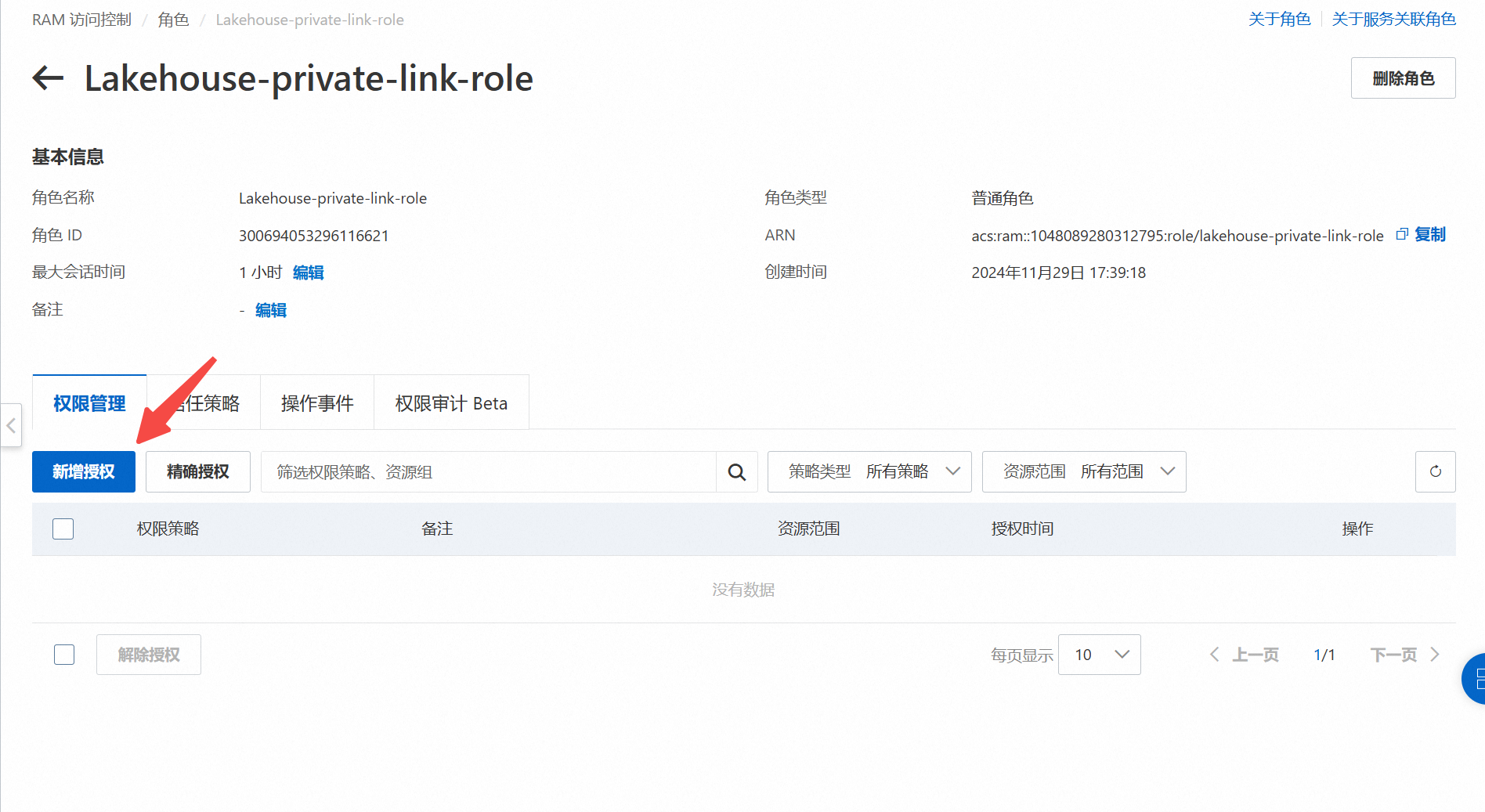 在配置Private Link访问Lakehouse网络时,为保障Lakehouse能够正常读取你云平台账号内的终端节点状态,并增强该获取方式的安全性,请在云服务平台内创建独立的访问控制角色,并授权及添加external ID。具体操作如下。
